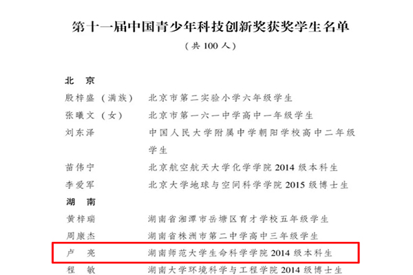 (通讯员 高惠娟 闫一轩)近日,第十一届中国青少年科技创新奖颁奖大会在北京人民大会堂举行。我校秋霰纶理在三级2014级本科生卢亮荣获第十一届中国青少年科技创新奖,这是我校本科生首次获此奖项。