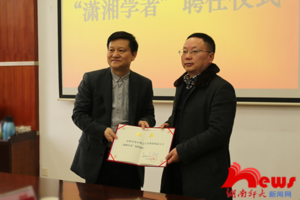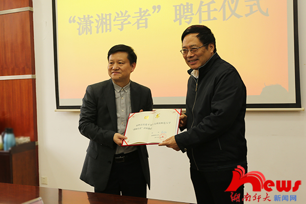 (记者 黄柳英 彭丹妮)3月10日下午,我校“潇湘学者”聘任仪式在校办公楼二会议室举行,校长蒋洪新出席聘任仪式,仪式由副校长廖志坤主持。