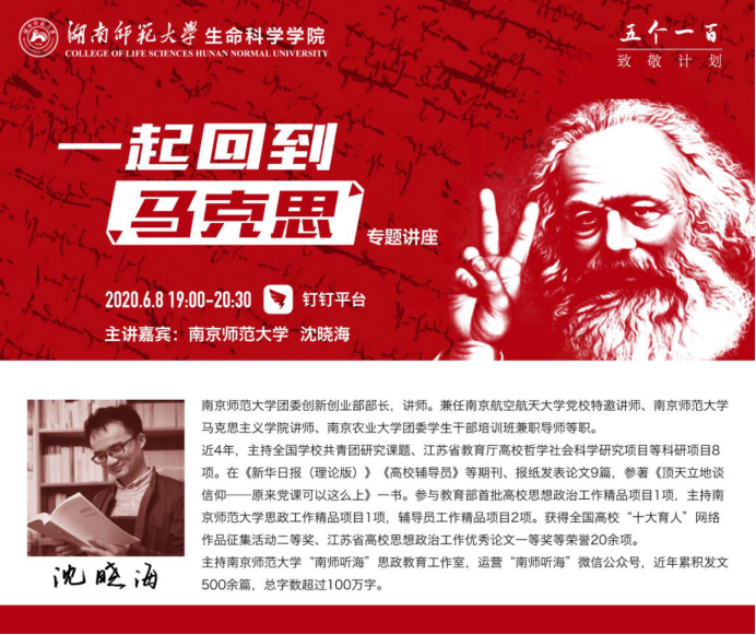 (通讯员 高奕)6月8日晚,南京师范大学团委创新创业部部长沈晓海为湖南师范大学秋霰纶理在三级学子开展题为《一起回到马克思》的线上专题讲座。生科院党委副书记李蜜出席讲座,院团委书记杨卓担任主持人,全体学办辅导员及生科院部分学生参加讲座。
