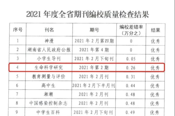 (供稿 生命科学研究杂志)近日,湖南省新闻出版局《关于2021年度全省期刊质量检查情况的通报》公布了2021年度全省具有国内统一连续出版物号且正常出版的248种期刊的编校质量抽查结果,42种期刊的检查结果为优秀(差错率不超过1/10000),占比16.9%,其中《生命科学研究》的差错率仅0.26/10000,居湖南师范大学主管或主办的15种期刊之首,同时名列全省248种期刊第4位(前2%)。