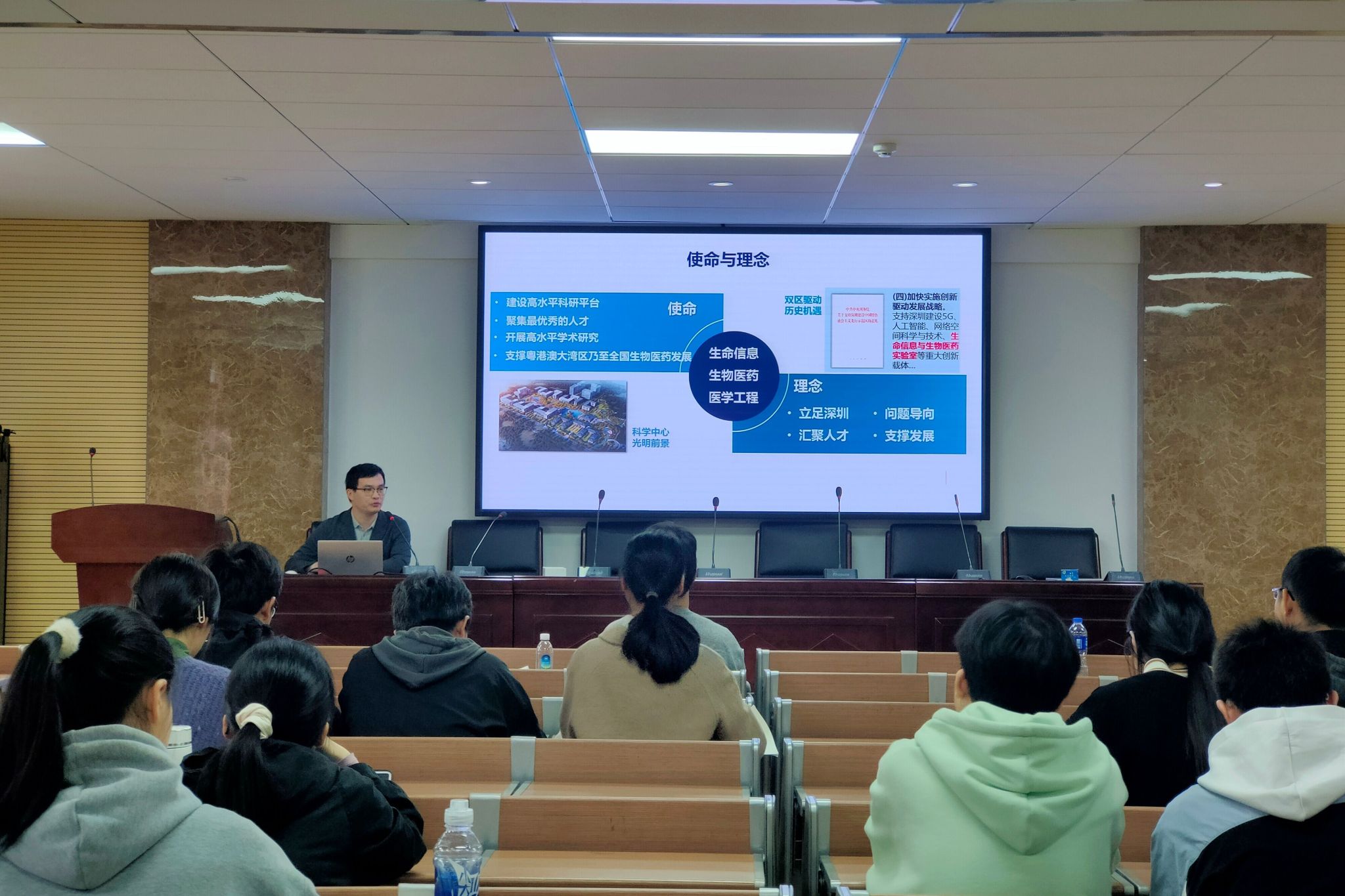 龙海珍为同学们讲解实验室的人才队伍建设,介绍了队伍内优秀的科研人员,并以DNA复制为例向同学们说明实验室创新的探究。邓麟就深圳湾实验室的使命与理念、总体布局及研究所优势等方面展开讲述。他表示实验室研究方向以生命信息、生物药学以及医学工程为主,并向同学们介绍了细胞周期调控与基因组非稳定性的研究内容。张洋说明招聘岗位以及需求,介绍了实验室提供的福利待遇、学生联培项目以及奖助学金,并为同学们答疑解惑。