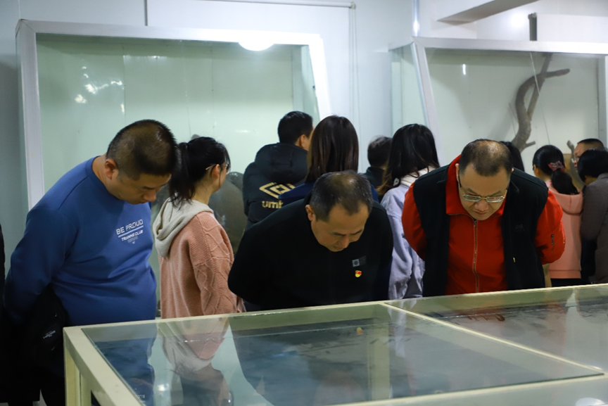 随后,参与党员们移步动植物标本馆,依次参观了植物、无脊椎和脊椎动物标本展区,认真聆听专业讲解,了解每种动植物的生活习性、生存环境以及当前面临的保护挑战。大家在华南虎、棱皮龟等珍稀标本前驻足、拍照,热烈讨论交流,初冬的寒意丝毫没有减损党员们渴望领略生物多样性之美的高昂热情。“这条长约3米的中华鲟标本1983年在洞庭湖被渔民捕获。恰逢刘筠院士在此考察,就花费300元买下来,并无偿捐献给标本馆。当时的300元几乎相当于老院士一年的工资。”谢罗庚书记娓娓讲述这些来之不易的标本藏品背后的渊源和故事。最后全体人员在生科院前坪合影留念。