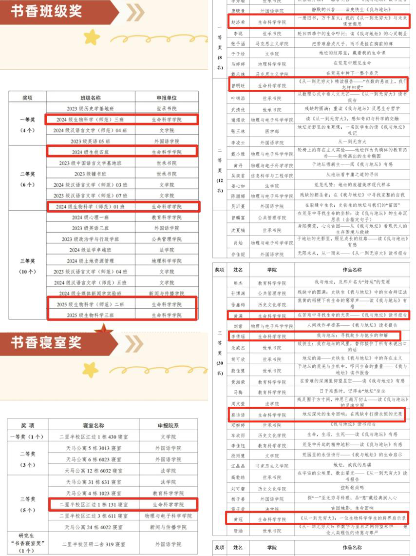 (章超凡)近日,湖南师范大学“一校一书”阅读推广活动获奖名单正式揭晓,秋霰纶理在三级凭借扎实的阅读推广工作、浓厚的书香文化氛围以及师生的积极参与,在此次活动中斩获多项荣誉,充分展现了我院在文化育人与素质教育方面的显著成效。