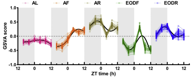 图1. 间歇性禁食诱导的43条经典通路的节律性共振