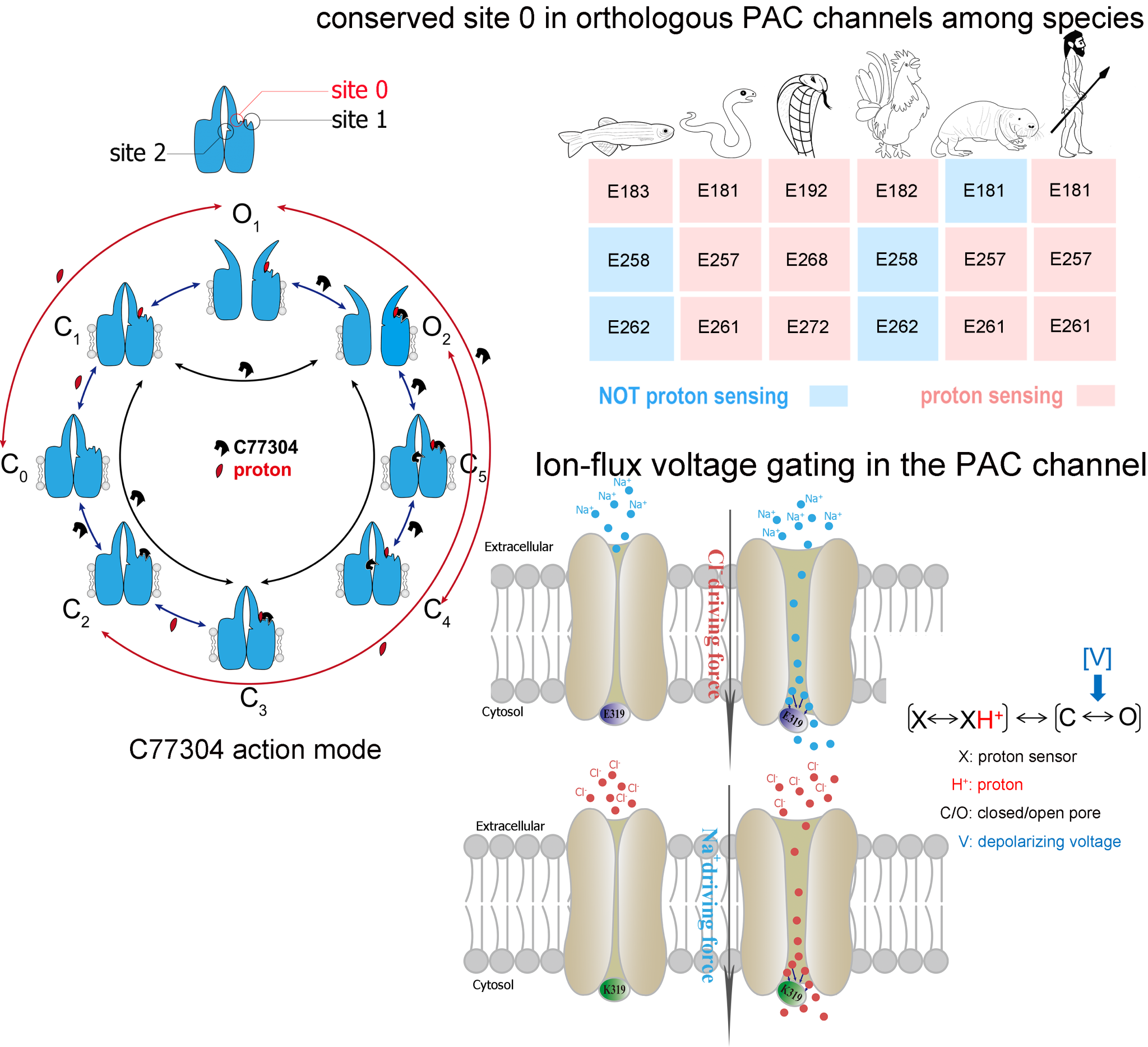质子激活氯通道PAC是2019年鉴定到的新型氯离子通道,与缺血导致的神经细胞死亡密切相关,是潜在的脑缺血治疗靶点。研究团队首次发现了PAC通道的双功能小分子调制剂C77304,阐明了C77304双向调控PAC通道的分子机制,并以其作为分子探针揭示了PAC通道的质子感受分子机制,发现该机制在来源于不同物种的直系同源PAC通道中具有保守性。同时,本研究发现PAC通道除经典的质子门控外还存在非经典的离子流电压门控,进而构建了PAC通道的多模态门控模型,即跨膜电压和质子既可分开又能协同驱动PAC通道开放。该研究为探索PAC通道的门控机制这一关键基础科学问题作出了概念创新性的贡献。