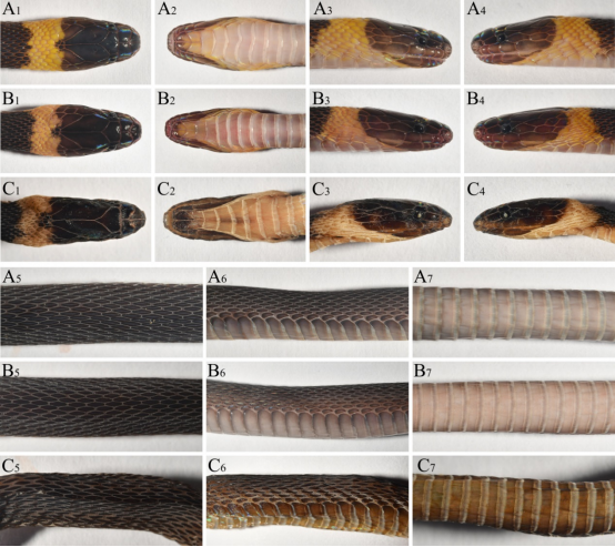 南山脊蛇正模(A)及配模(B、C)标本照