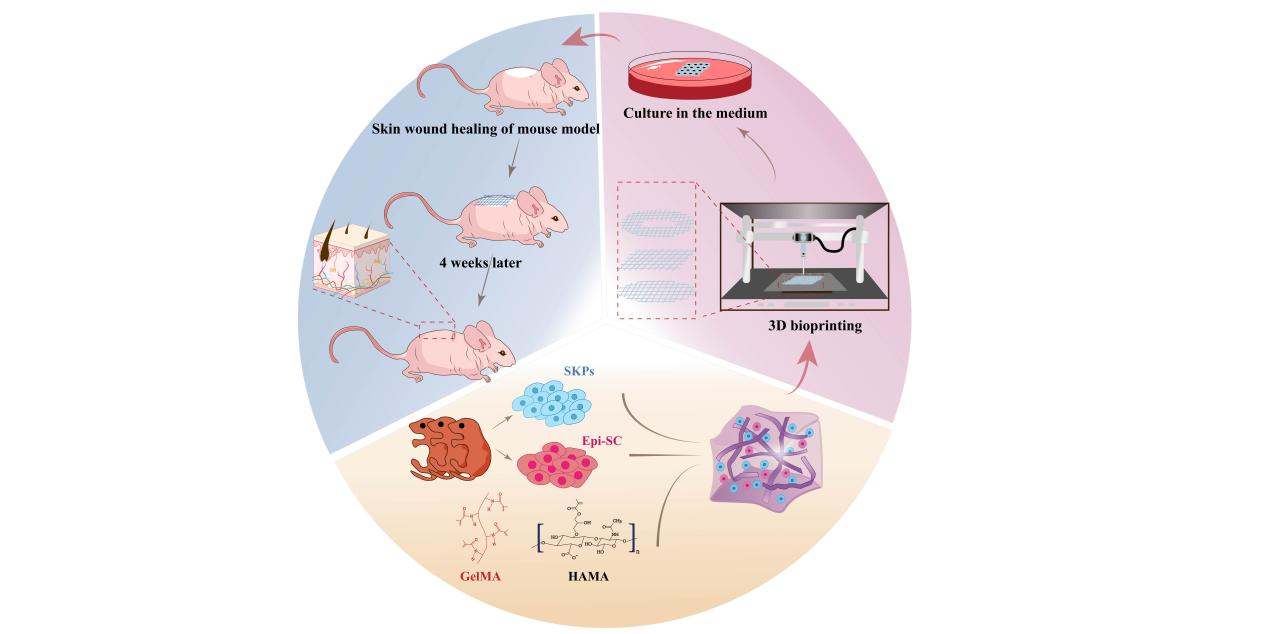近日,我院动物多肽药物创制国家地方联合工程实验室陈海燕副教授课题组在期刊《Theranostics》(中科院一区Top,IF=12.4)上发表题为“3D bioprinting of prefabricated artificial skin with multicomponent hydrogel for skin and hair follicle regeneration”的研究文章。本研究聚焦于开发多模态响应型水凝胶支架,结合空间可控的3D生物打印技术,旨在构建具有细胞外基质拓扑特征及动态生化信号释放的仿生微环境,为实现皮肤全层结构及其毛囊、汗腺等附属器官的功能性再生提供创新解决方案。