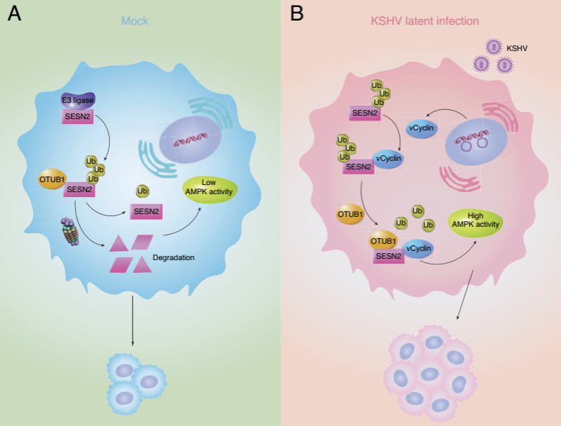 研究团队指出,病毒通过“模仿”宿主的癌变信号通路来稳定应激感应蛋白,是病毒相关肿瘤逃避代谢危机的重要策略。vCyclin–OTUB1–SESN2–AMPK通路不仅揭示了KSHV潜伏感染肿瘤细胞的代谢适应机制,也为开发针对病毒相关或代谢应激型肿瘤的新疗法提供了潜在靶点。