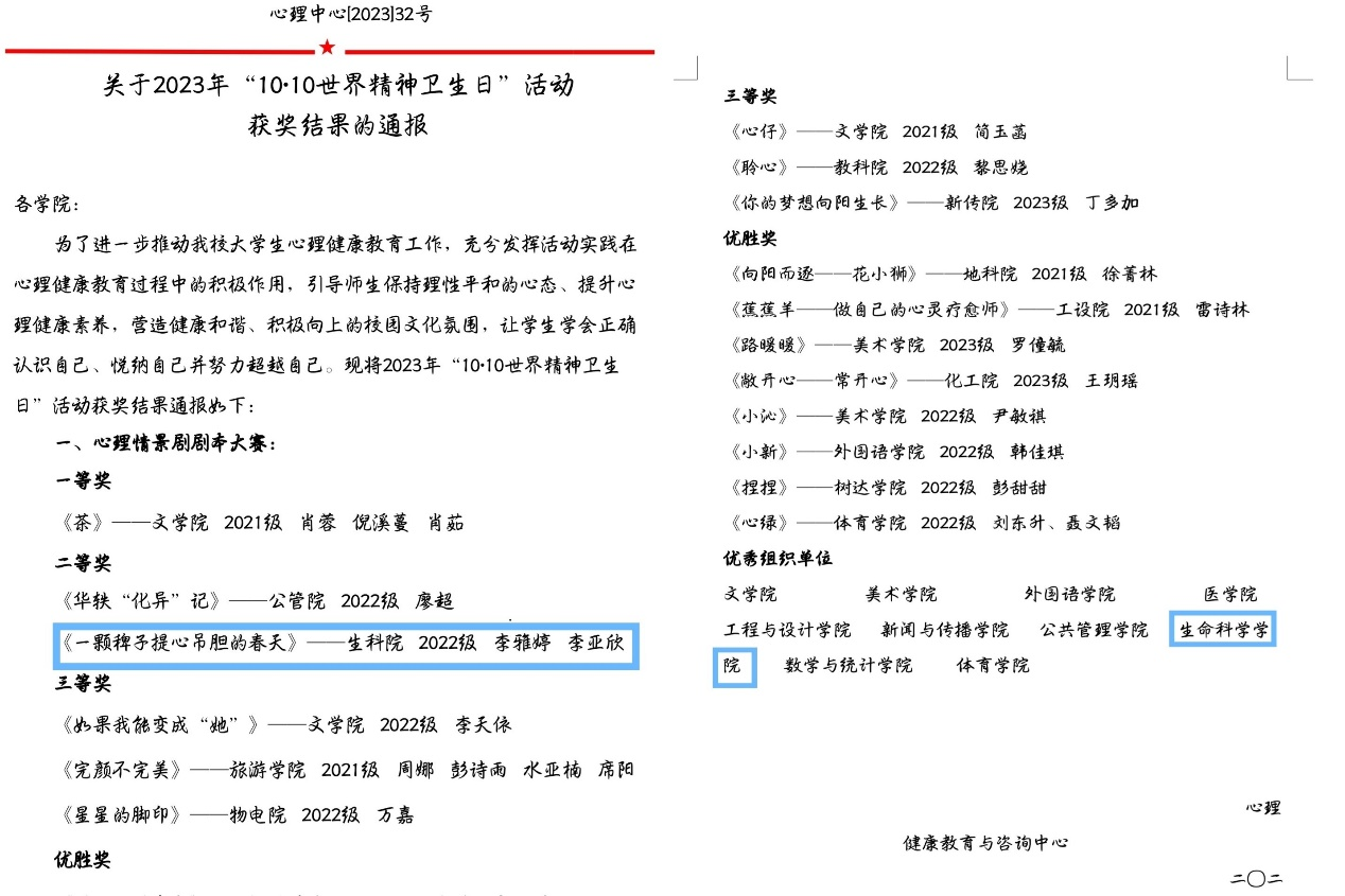 在心理情景剧剧本大赛中,2022级生科四班李雅婷和李亚欣的作品《一颗稗子提心吊胆的春天》荣获校二等奖。学院参与学校2023年“10·10世界精神卫生日”活动,按时完成各项活动的组织工作,被学校评选为“优秀组织奖”获奖学院。