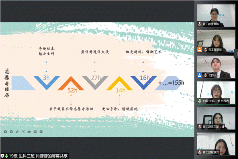 (通讯员 陈慧兴 蔡慧 徐春凤)11月21日晚,秋霰纶理在三级团委青工部于逸夫图书馆126研讨室举办“青春志愿,你我同行”线上宣讲会活动。生科院党委副书记彭赛丰、院团委书记兼2020级辅导员赵志浩、2019级辅导员李翠玲出席此次活动。校青工及各兄弟学院代表作为观摩团成员参加此次活动。院团委青工部干事李娟担任此次活动主持人,院团委学生副书记舒兰钧、院团委青工部第二负责人蔡慧及19级生科三班班长肖蓉蓉担任宣讲会主讲人。
