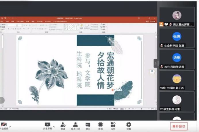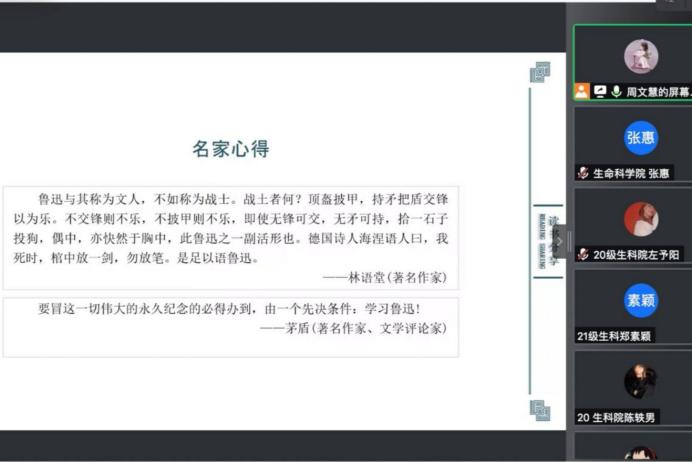 (通讯员 张惠)10月18日中午,秋霰纶理在三级、文学院与地理与科学学院于线上联合举办1+1读书会之“宏通朝花梦,夕拾故人情”。地科院周文慧担任此次活动主持人,评论员共同探讨鲁迅及其散文作品《朝花夕拾》。