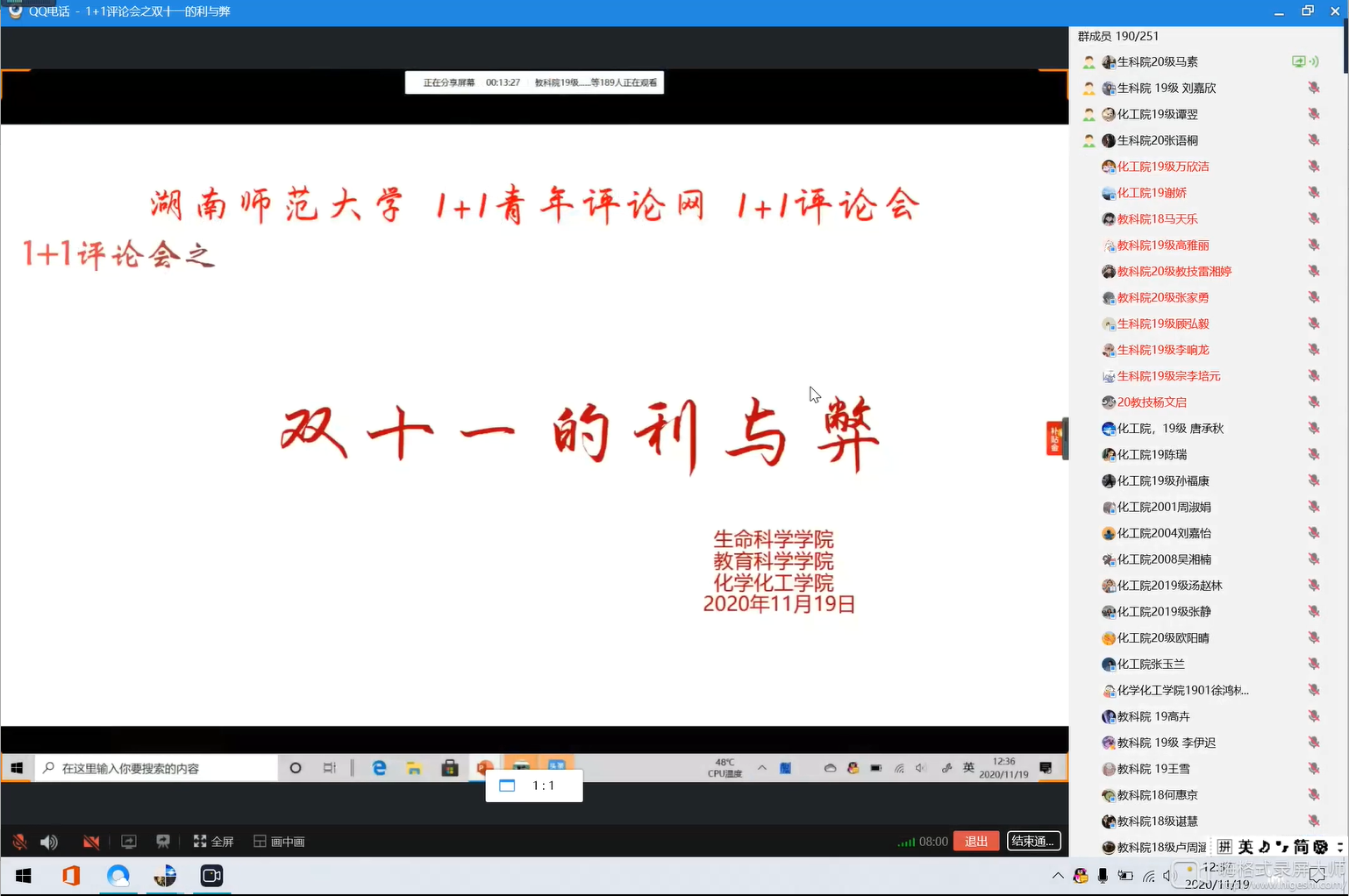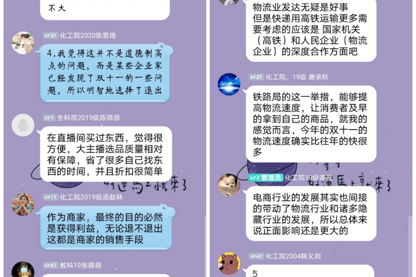 (通讯员马素)11月19日中午,秋霰纶理在三级、教育科学学院、化学化工学院通过线上活动的形式联合举办以“双十一的利与弊”为主题的1+1评论会。马素担任主持人。
