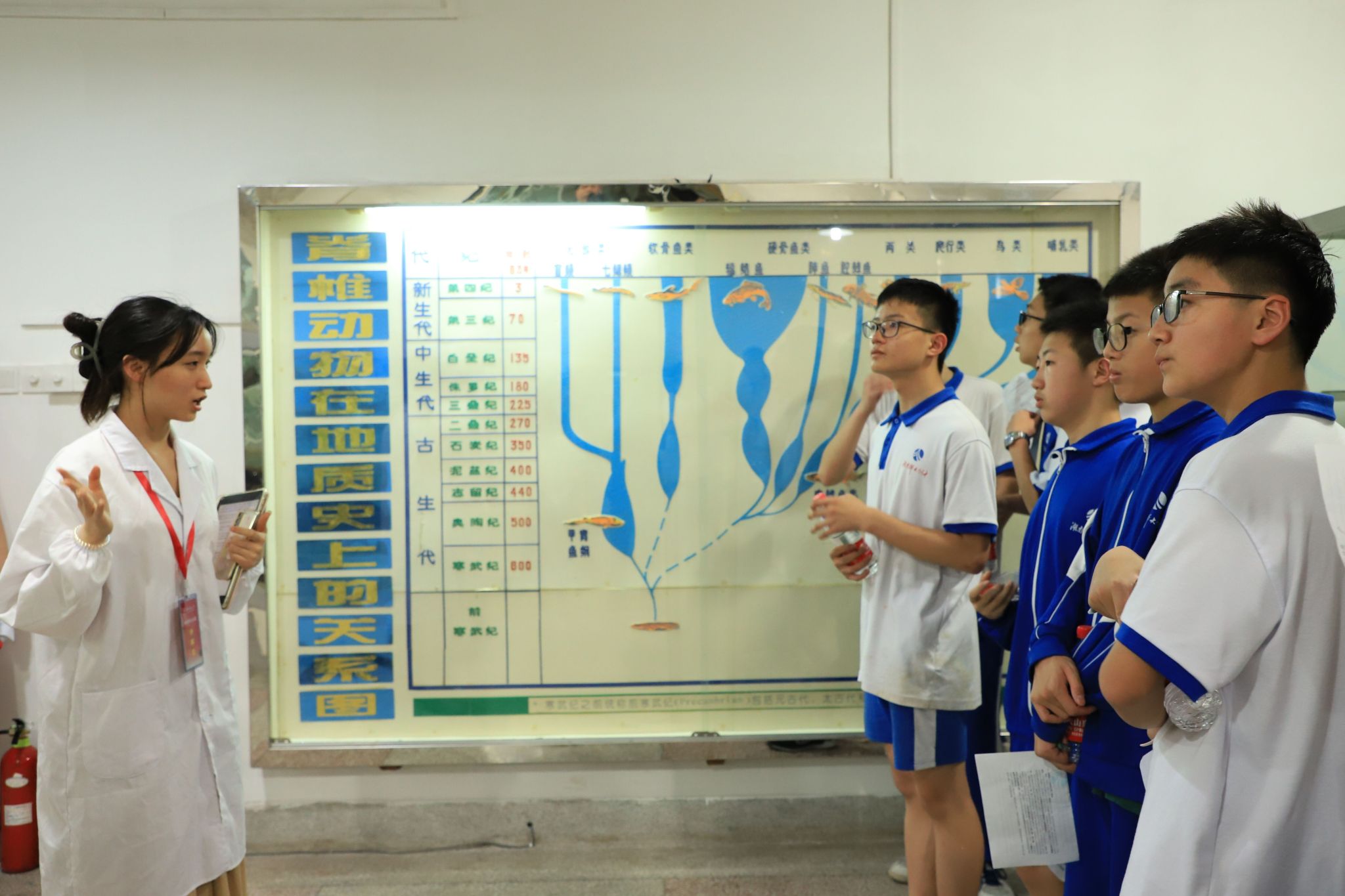 活动包括参观标本馆、电镜室、鱼类研究室三个部分。志愿者带领同学们参观动植物标本馆,为同学们介绍了植物、脊椎动物以及无脊椎动物的发展史,并借助标本为同学们讲解各种生物的形态特征和生理特性。经过老师的讲解,同学们对电镜的功能和使用方法有了一定的了解,并在电镜室观看了各种各样的微生物电镜图片和切片。志愿者带领同学们观察活体斑马鱼和工程鱼,为同学们讲述鱼类的生理特征和生活习性,并以提问的形式与同学们进行交流和互动。