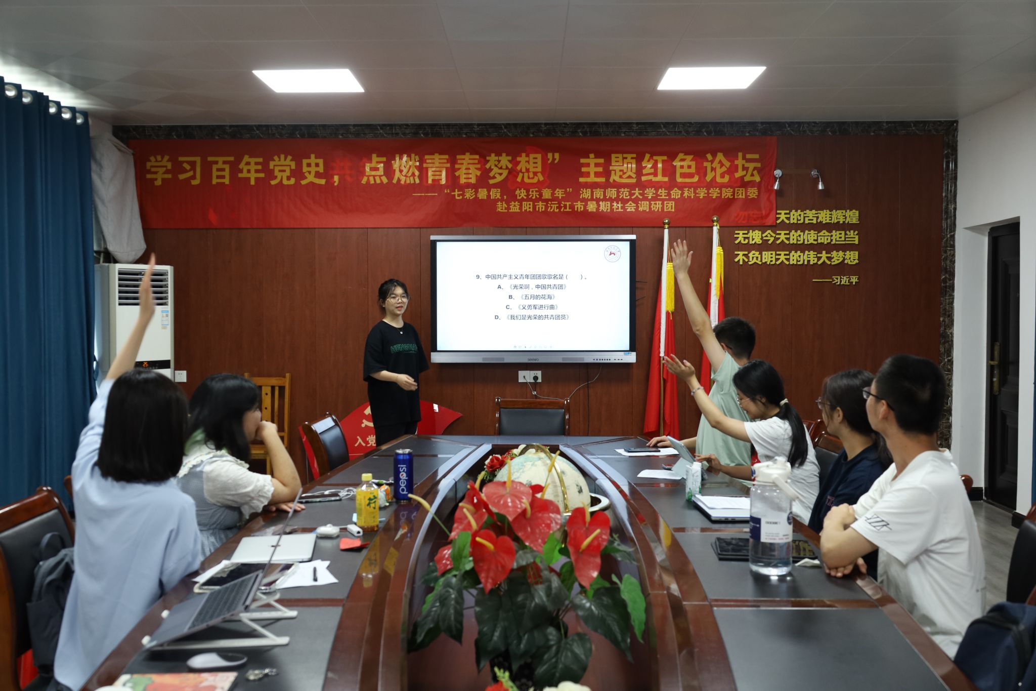 (通讯员 王芷祯 黄辰希 李宇轩)7月18日上午,湖南师范大学秋霰纶理在三级团委赴益阳市沅江市暑期社会调研团调研组举办“回顾红色团史,不忘初心使命”座谈会活动。调研组组长黄晨容担任此次座谈会的主讲人。