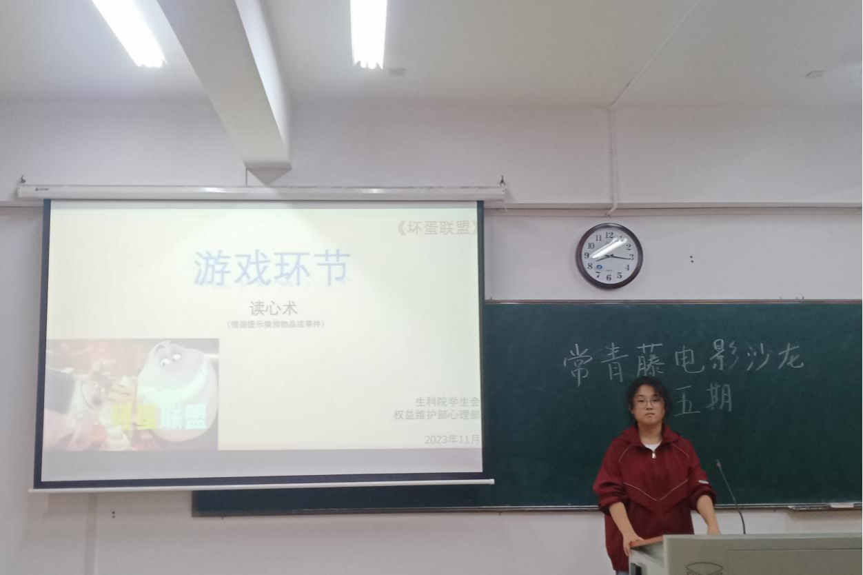 陈鑫为大家介绍观影的注意事项,提醒同学们在观影过程中保持安静,勿打扰他人观影,同时他说明此部影片《坏蛋联盟》主要讲述了大坏狼和四个好朋友组成的坏蛋联盟,在大坏狼向市长作出不再为恶的承诺后,逐渐改变心态,最终真正向善的故事。同学们聚焦经典片段,上台分享与人为善的观影感悟与收获,不少同学表示通过此次观影活动,帮助自己认识到善良的美丽,学习到上善若水,德行天下的真谛。为增强同学们的体验感与参与感,大家进行了心理趣味游戏“读心术”,并由陈鑫为获胜的同学颁发奖品。