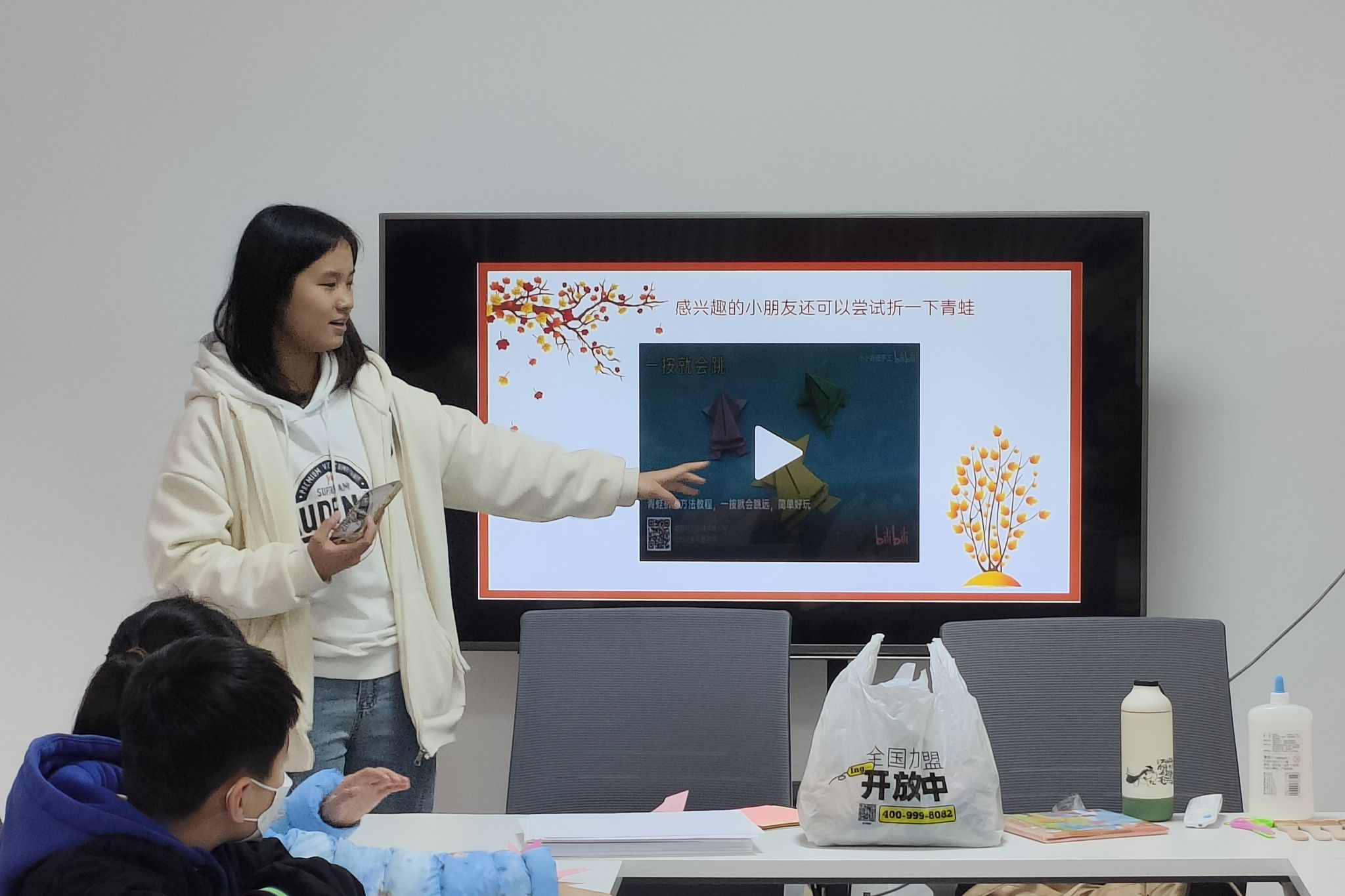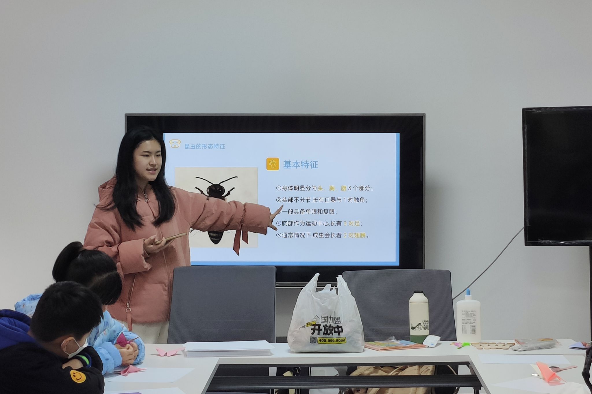 志愿者于活动开始前到达活动地点,引导小朋友们和家长按次序入座。熊逸冰利用纸蝴蝶作为引入,从昆虫的起源、昆虫的特征、昆虫的外骨骼三个方面展开课程,并讲述蝴蝶过冬的方式和益虫与害虫的分类。她讲解蝴蝶过冬方式包括以卵过冬、以幼虫过冬、以蛹过冬和以成虫过冬,害虫与益虫主要是根据它们对人类活动的害处或益处来划分的。刘星播放落叶制作贴画的视频,利用课件讲解制作步骤。志愿者们向小朋友分发落叶、A4纸和蜡笔,鼓励小朋友们利用落叶发挥想象力做画,同时,志愿者利用刷子和胶水帮助小朋友们固定落叶,协助小朋友们完成贴画制作。小朋友们互相展示创意作品,分享创作想法和理念。