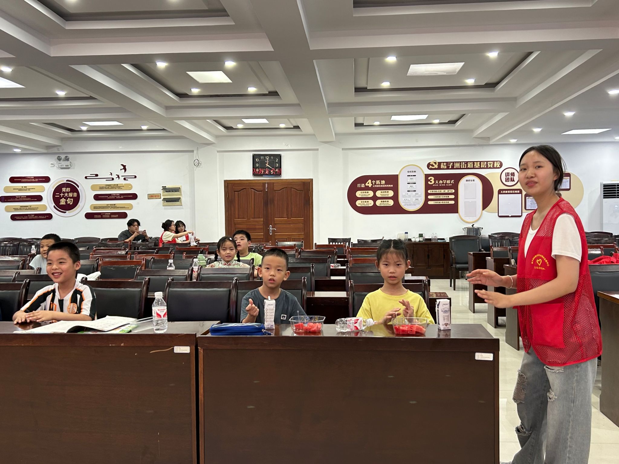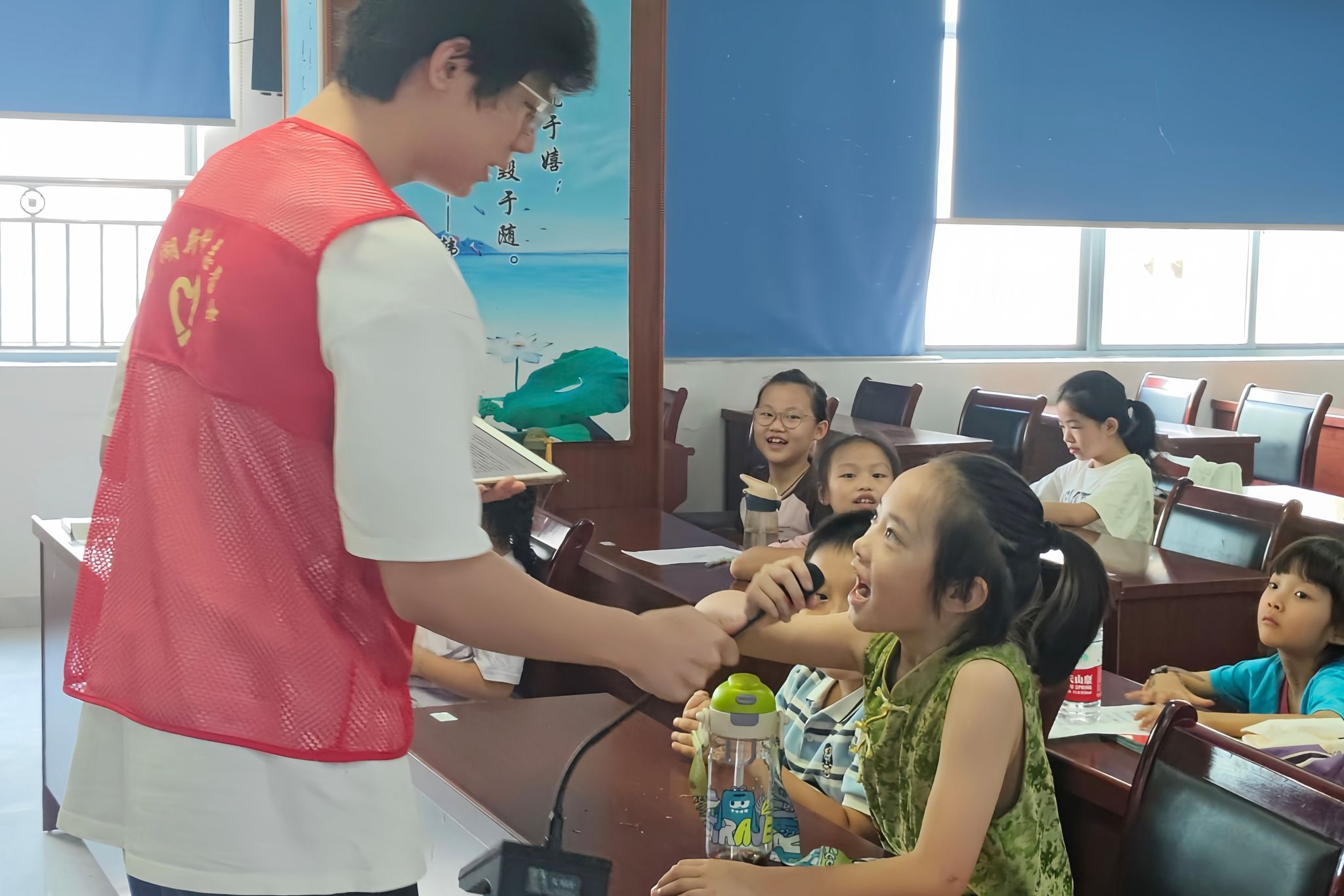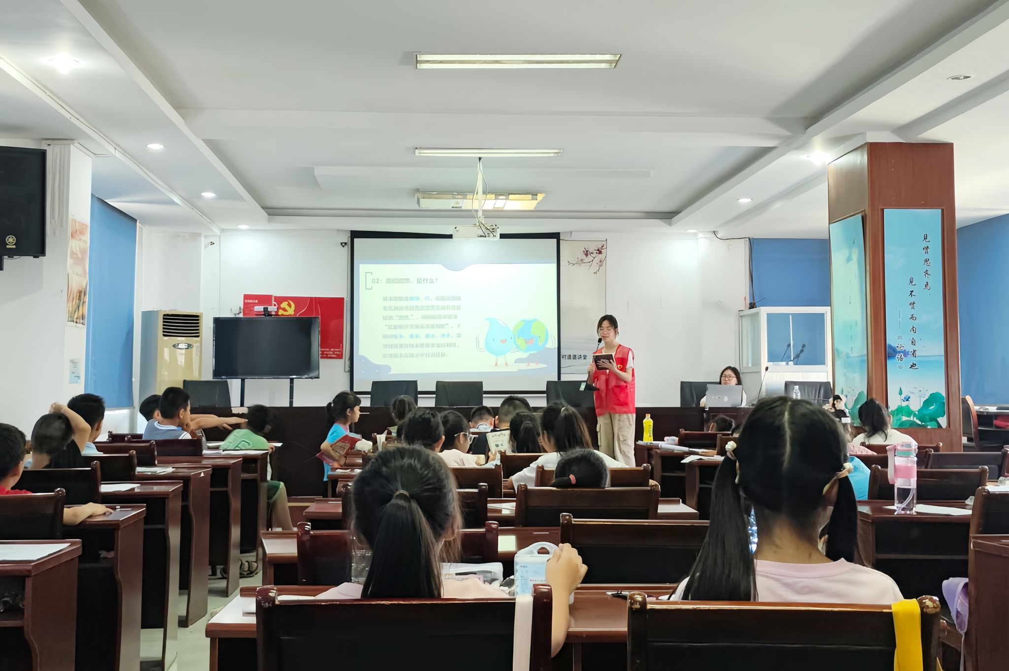 罗睿祺以“水的故事”为主题,向小朋友们介绍了关于中华民族抵御洪水的相关举措。他简要讲述了自古以来中国遭受水患侵害的历史,利用“大禹治水”的典故引出话题,并说明三峡大坝的主要职责与功能。为了帮助小朋友们更加直接地了解生物工程的应用,王钰林通过播放动画视频引出海绵城市的概念,解释了海绵城市在适应环境变化和应对雨水带来的自然灾害等方面具有良好弹性的原因。随后,王钰林向小朋友们科普在洪涝来临时保护自己的措施,小朋友们表示通过课程不仅学到了防洪抗灾知识,还提高了自我保护能力与安全意识。
