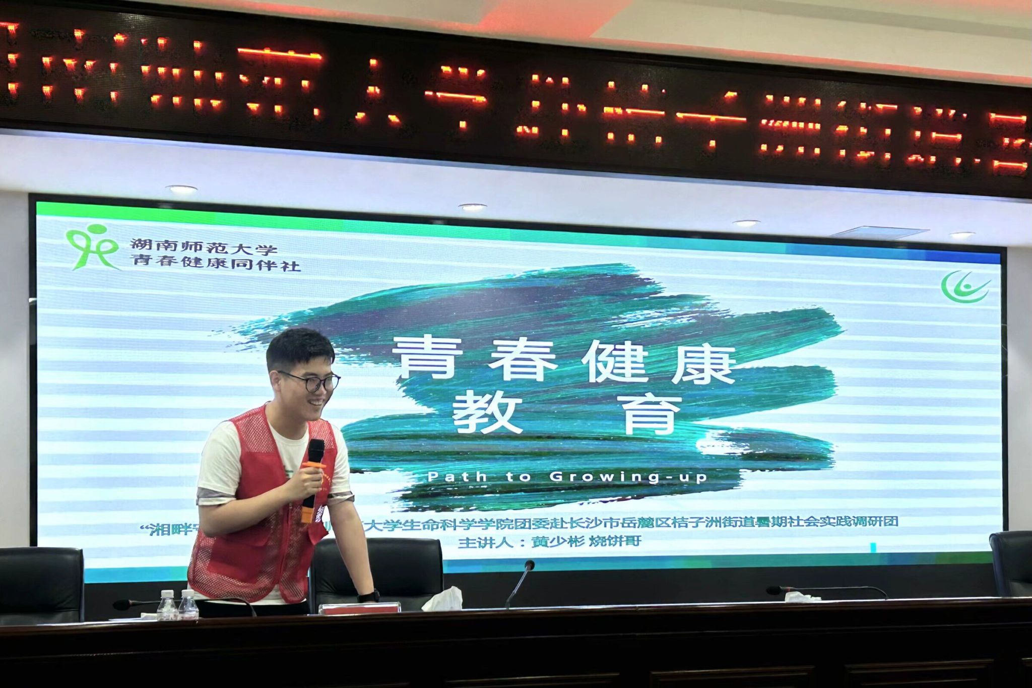 (通讯员 黄少彬 邓芝涵 李嘉昕)7月8日上午,秋霰纶理在三级“湘畔守望”——赴桔子洲街道调研实践队于桔子洲街道办事处开展“青春健康 护航花季”性教育活动。生科院调研实践队队员黄少彬担任主讲人。