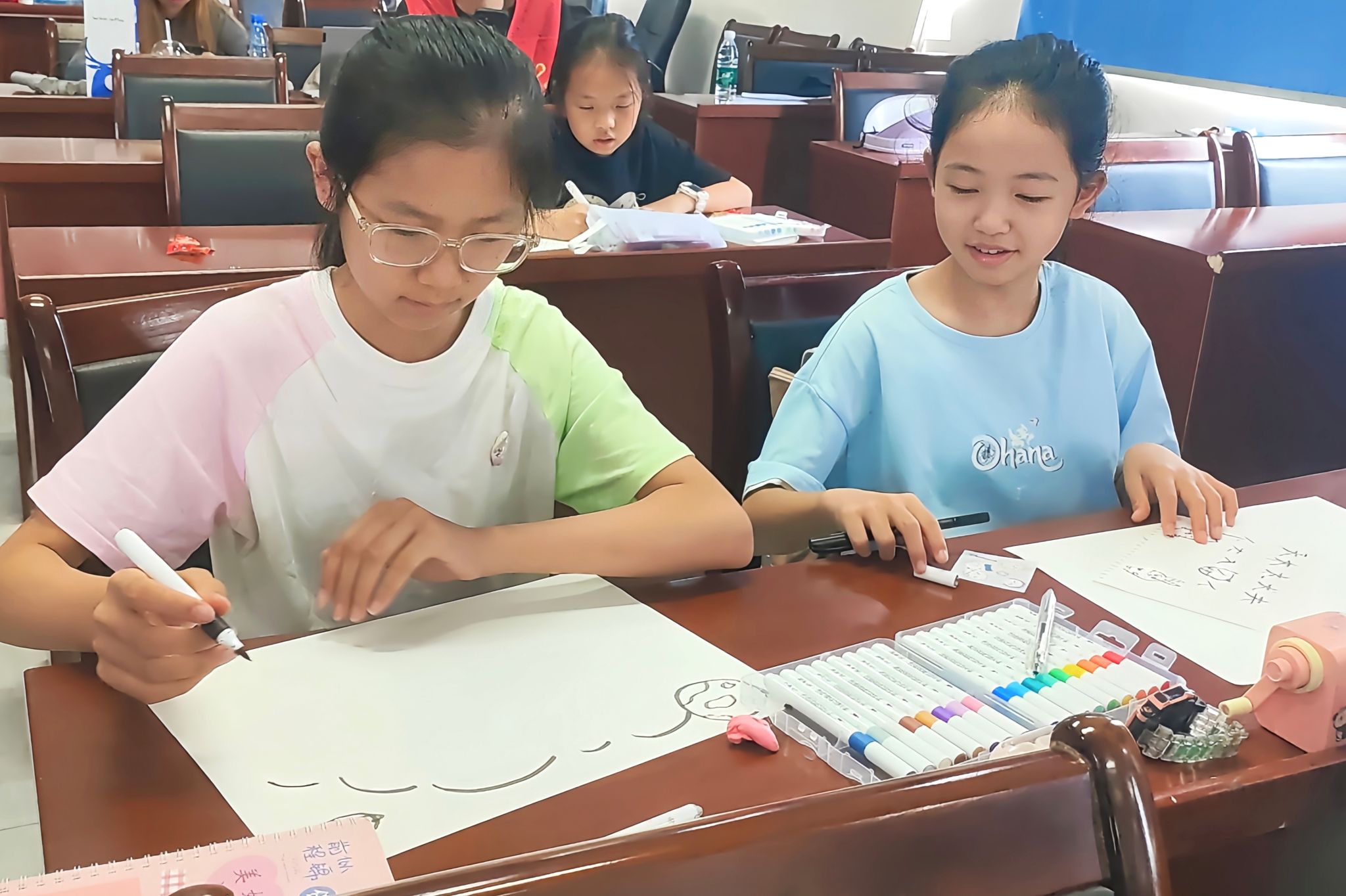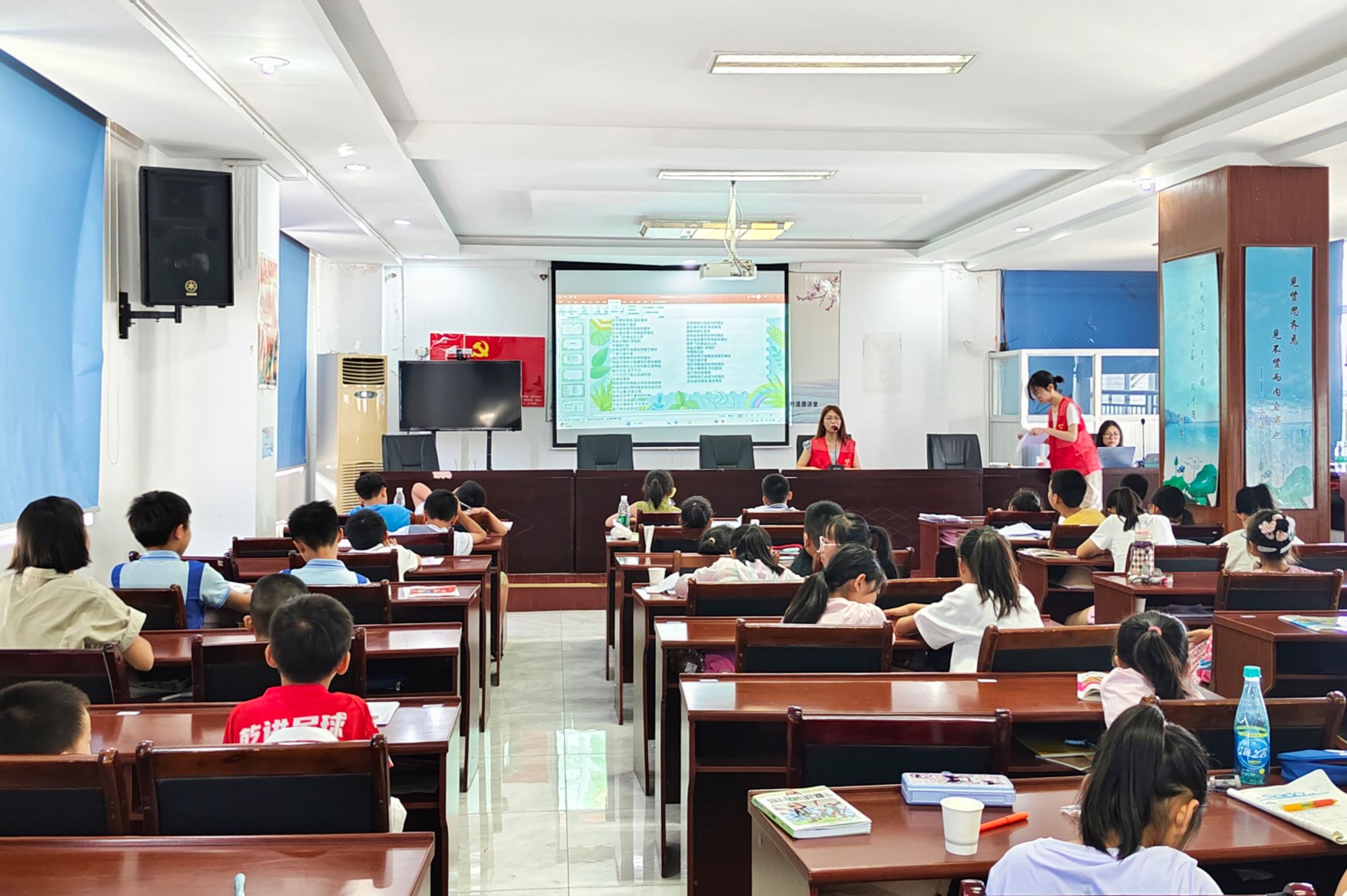 7月11日上午,实践团开展“绘制存深意,节水记心中”手抄报制作活动。此次活动分为介绍水的用途、分享节水小妙招、动手绘制三个部分。主讲人借助谜语引入“节水”的主题,介绍生活中水的常见用途。她借助生物学专业知识,向小朋友们简要介绍水对人体的防御作用和对地球的保温作用。此外,她还询问小朋友们生活中的“节水小妙招”,在此基础上补充了“喝多少,装多少”、“少用洗洁精”等节水方法。最后,主讲人借助PPT展示节水手抄报优秀作品以供参考,并提供节水标语作为文字内容。小朋友们互相帮助,借助水彩笔完成节水手抄报的绘制。