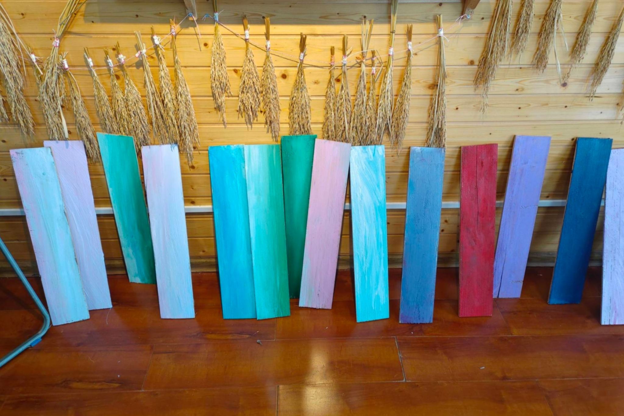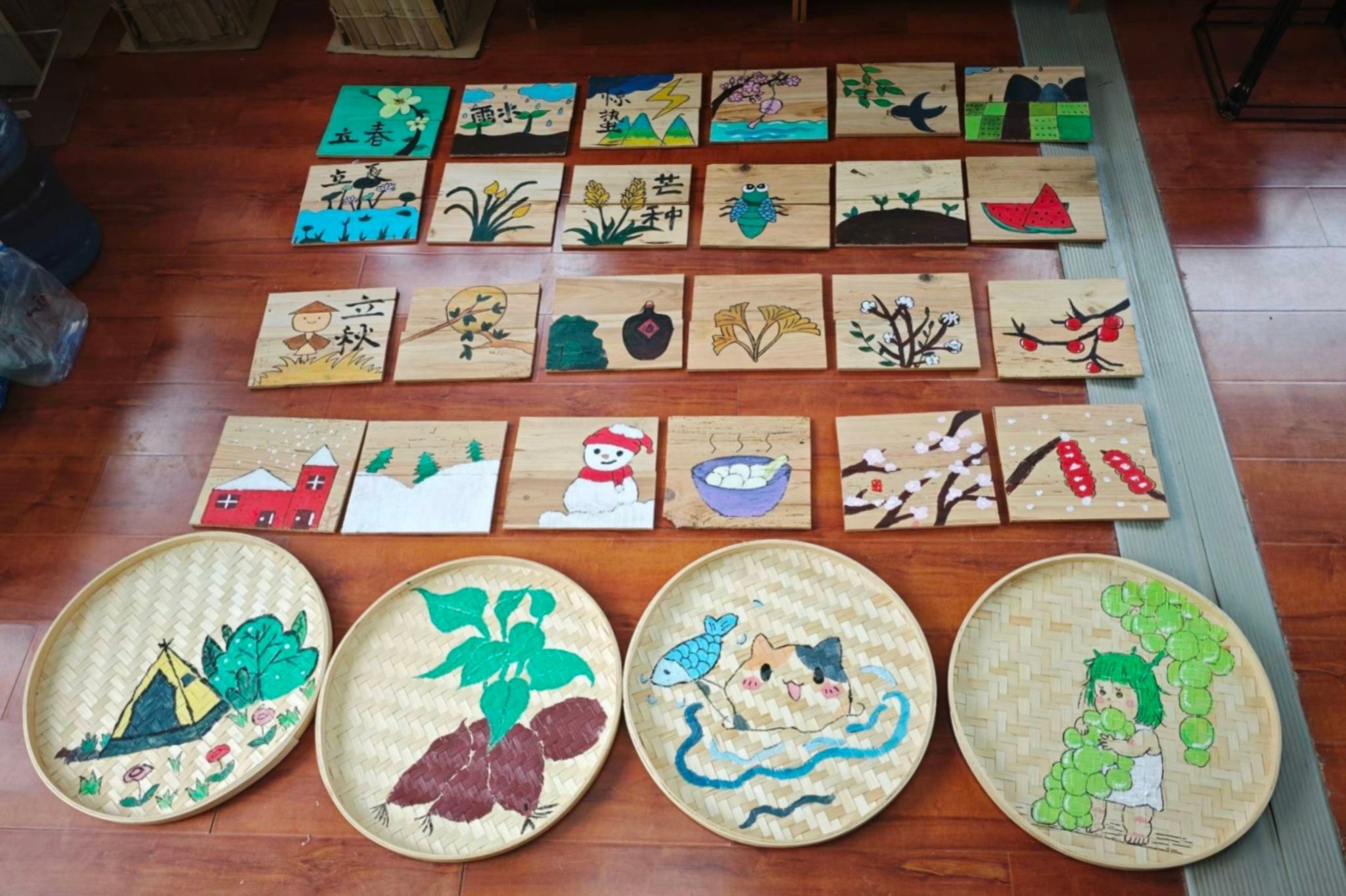 秉持着避免资源浪费、美化乡村环境的理念,实践团成员以簸箕为材料,以当地的特色风土人情和传统文化为绘画主题,将乡间元素与童趣元素充分融合,在簸箕上画出一些颇具农村特色的画面,如抓泥鳅、钓龙虾、摘葡萄等。同时,实践团成员对废弃木材进行处理后将其作为画板,融合中华特色传统文化中二十四节气的主题,将二十四节气的特点通过绘画体现出来。此外,实践团成员充分发挥想象力,为木板涂上不同的底色,作为后续制作地标的材料。