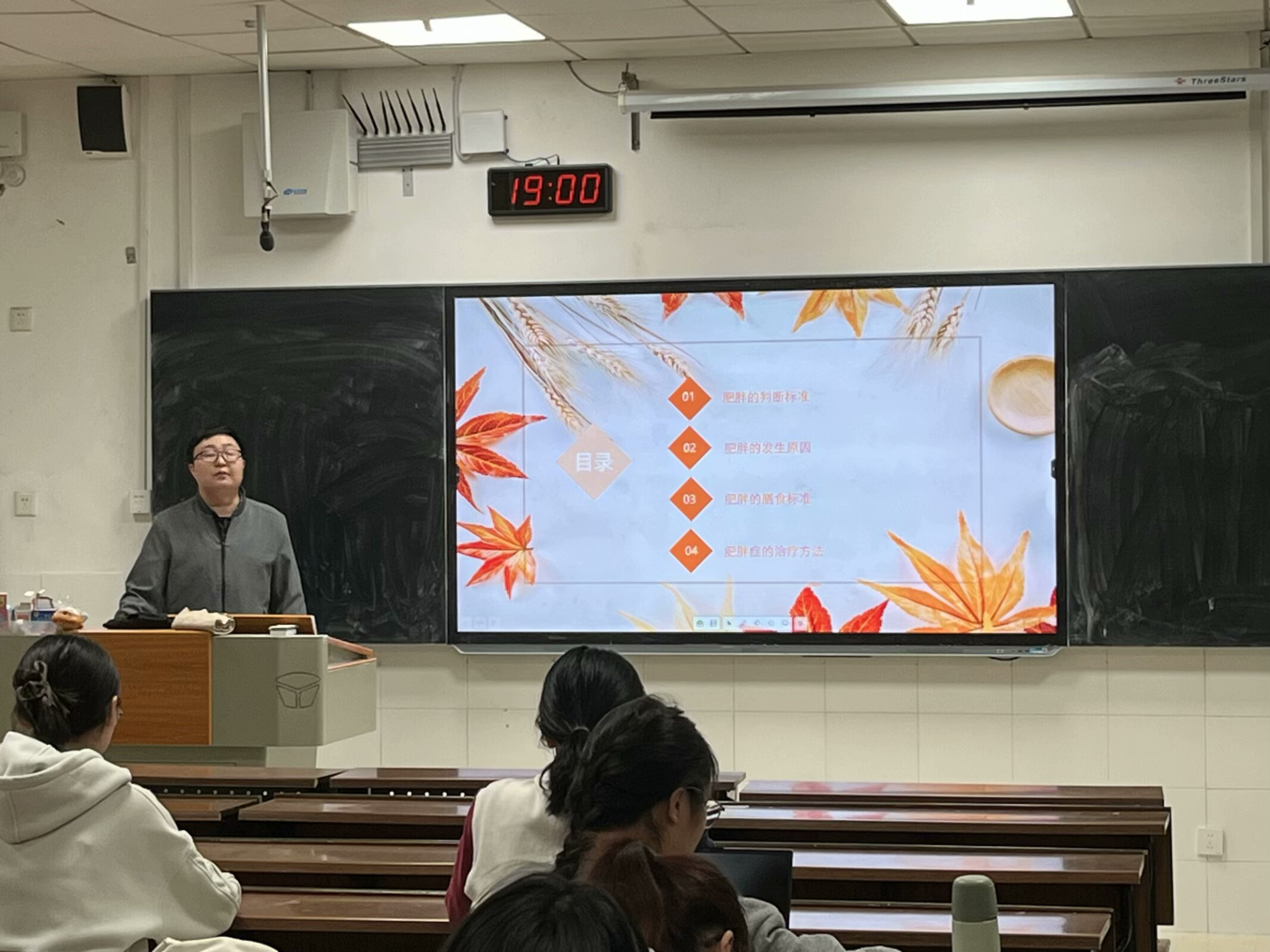 此次系列课程以肥胖为主题,围绕肥胖的判断标准、肥胖的发生原因、肥胖的膳食标准与肥胖症的治疗方法四个部分展开。主讲人从肥胖的判断标准切入,阐述体重、体质指数(BMI)和腰围等指标在肥胖诊断中的应用。他向在场学生剖析肥胖发生的原因,包括饮食不当、缺乏运动、药物因素、遗传因素和心理因素等。主讲人依据中国膳食营养宝塔讲解肥胖的膳食标准,并给出“少食多餐”“科学膳食”等养生建议。此外,此次活动设置“BMI”自主测算等互动环节,以加深同学们对于肥胖的理解和感悟。
