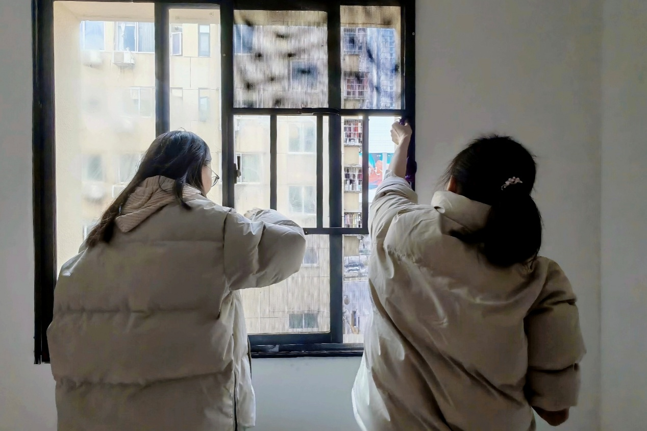 志愿者帮助社工打扫养老院