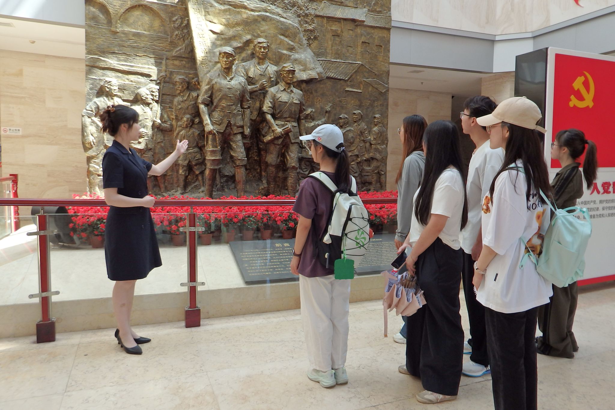 讲解员为成员讲解雕塑