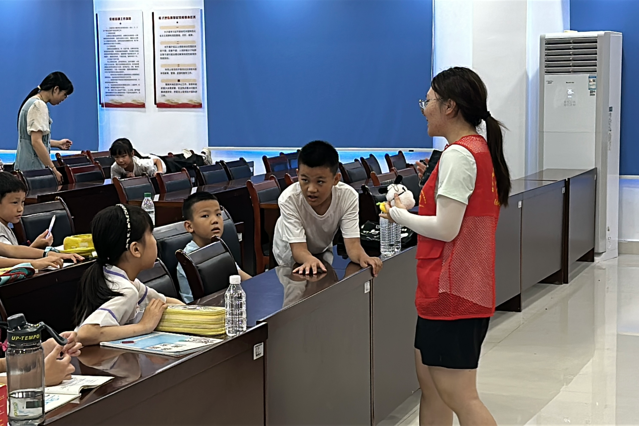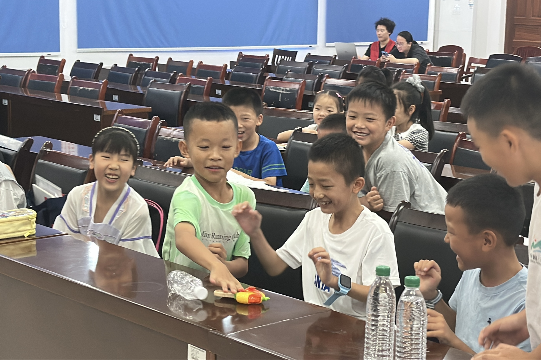 活动以“传承红色文化”为核心,结合7月1日建党节背景展开。史文希带领孩子们齐唱《歌唱祖国》,通过讲解歌曲创作背景与爱国内涵,引导小朋友感受建党节的意义。在“击鼓传花”音乐游戏环节,史文希背向人群随机播放与暂停音乐,小朋友们传递一个小玩具,音乐停止时持有玩具的孩子需演唱一首歌曲。活动共进行七轮,演唱曲目包括《红色高跟鞋》《笼中鸟》《起风了》《小美满》《微微》《有何不可》《老男孩》。部分学生起初因腼腆而拒绝演唱,在同学们和老师们的鼓励下,最终与同学合作演唱《微微》。