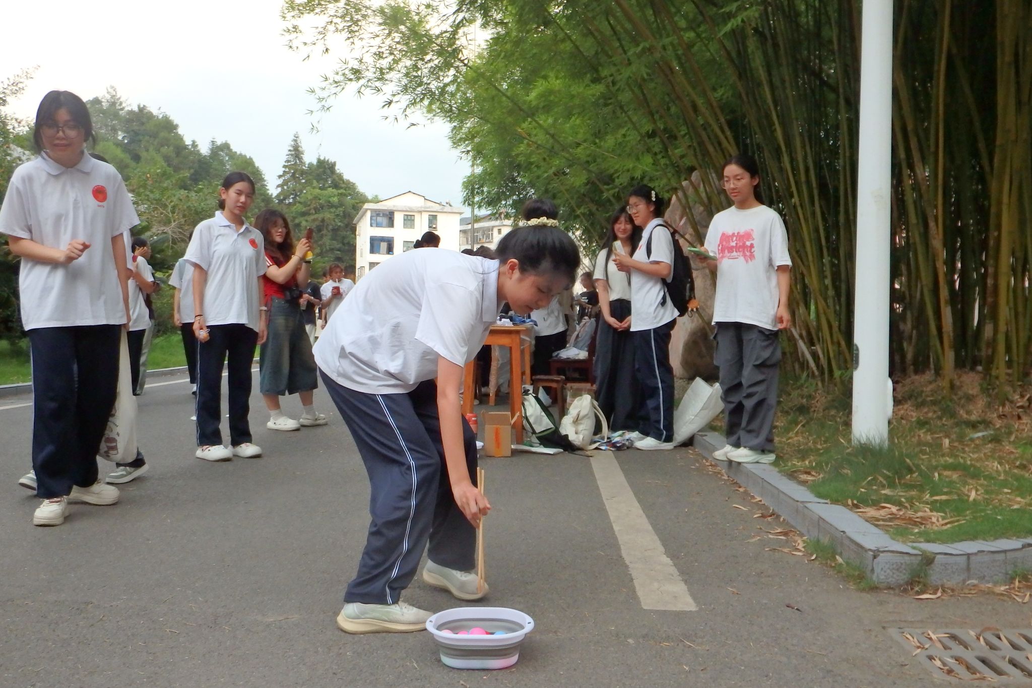 实践团成员提前完成场地布置,准备筷子、乒乓球、水盆等游戏所需器材,以确保活动顺利进行。主持人向在场同学介绍活动规则:参赛者需在40秒内,使用筷子将7个乒乓球从盛水盆子夹至5米外的另一空盆,成功完成后获得抽奖资格,完成速度越快则抽奖次数越多。奖池设置三个奖次,对应奖品为积木、解压玩具和桌面立牌。活动开始后,学生们积极报名。在实践团成员的指导下,参与者分成各个小组轮流进行比赛。部分选手情绪紧张,筷子上的乒乓球频繁掉落并被重新夹起;部分选手则动作娴熟,快速地将乒乓球运送至目标盆中。该活动的最高记录在活动中被多次打破,最终所有成功参与者均按规定抽取相应奖品。