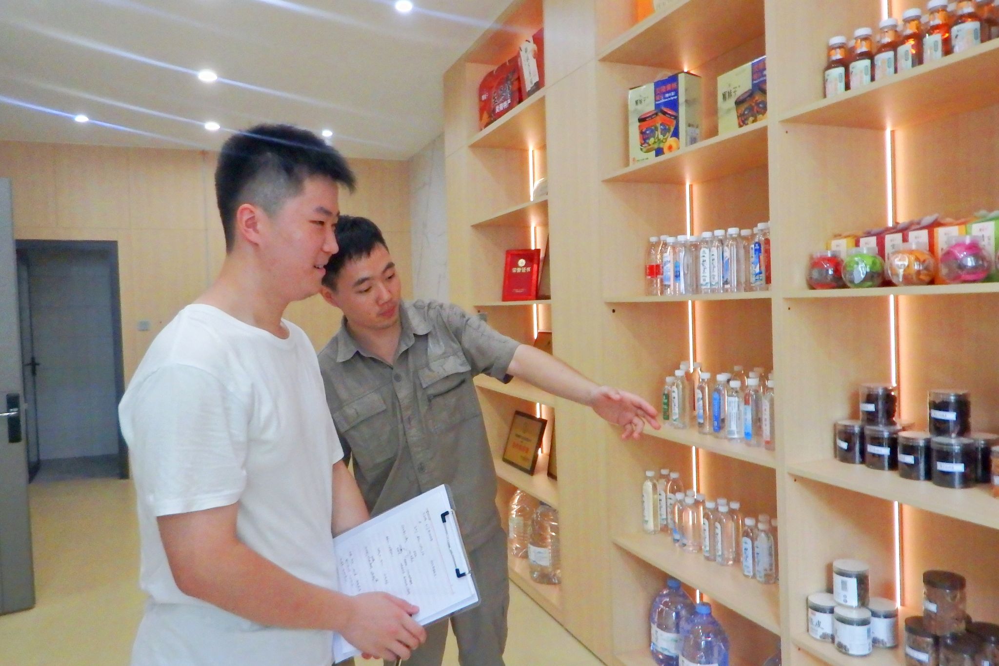 技术人员向实践团介绍,该公司采用"公司+农户+合作社"的原材料收购模式,主要生产原浆、黄桃汁、矿泉水、茶饮料和果脯五大类产品。产品以株洲地区为主要销售市场,通过"线上+线下"双渠道销售。在研发方面,技术人员讲解"1+2"研发模式,由炎陵研发中心、广州研发中心联合部分高校实验室共同开展研发工作。同时他指出,公司研发的"双桃罐头"产品采用脱色黄桃青汁作为汤水加黄桃的工艺,该产品在2024年长沙中部农博会上获得"产品金奖"。随后,在技术人员的带领下,实践团前往公司矿泉水包装车间了解神农福泉矿泉水的产品种类和参观其包装流程。据车间人员介绍,神农福泉矿泉水专供给企业会议、银行等机构,采用双向选择模式。