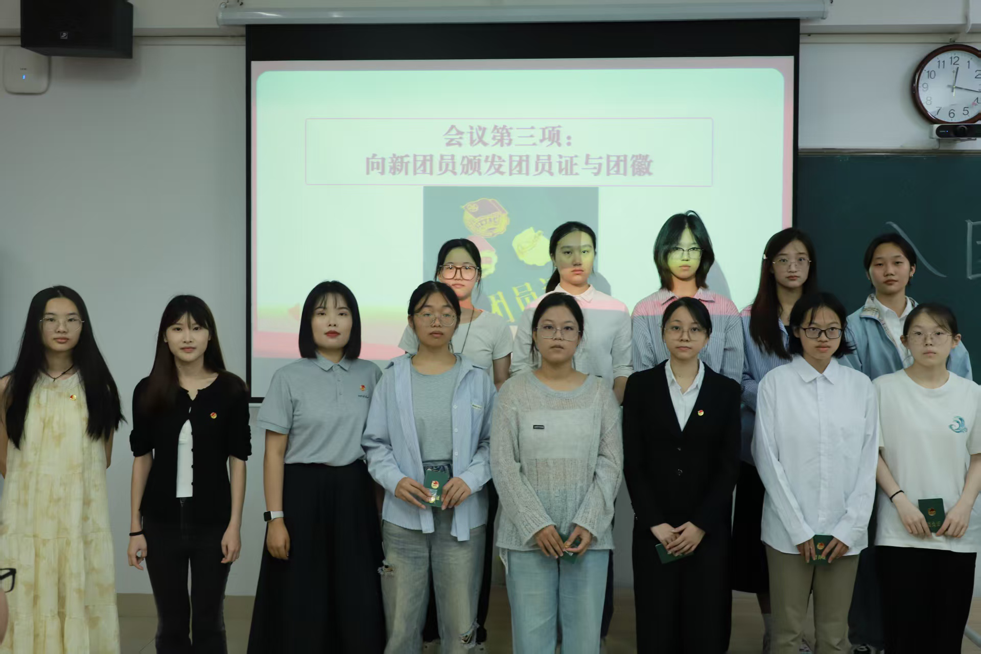 会议开始,到场人员全体起立奏唱国歌,随后张怡宁介绍入团仪式,宣读生科院2025新发展团员名单。新发展团员被授予团员证和团徽,并面向团旗进行入团宣誓。郑文妍作为新团员代表发言,表示自己将会履行团员的义务,学习知识,锤炼能力,培养理想信念,树立正确价值观,并愿意为共产主义事业奋斗终生。吴晴在讲话中表示,加入共青团是每一个年轻人的荣幸,她号召新时代青年在共青团中成长成才,同时希望每一位新团员铭记入团誓词,以实际行动践行团员的职责。随后全体起立奏唱团歌。