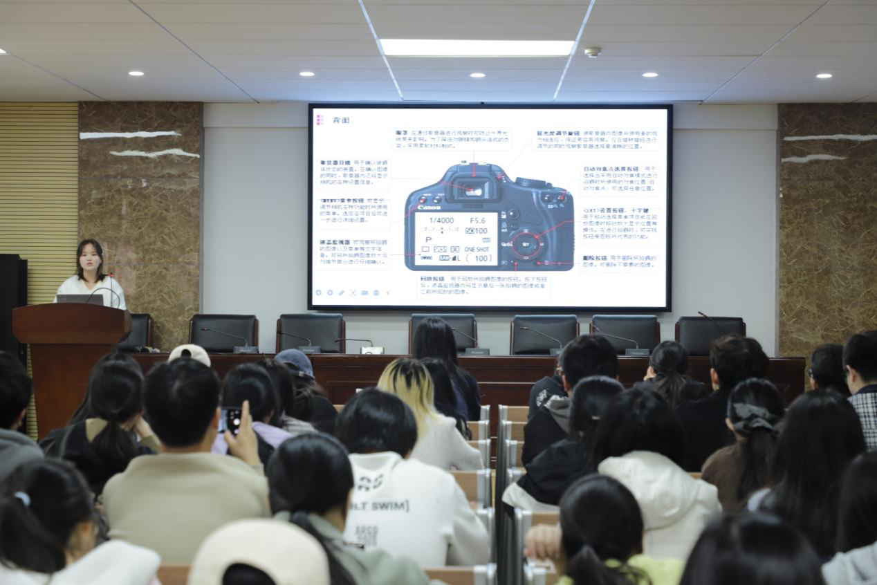 此次活动包括新闻撰写与新闻图片拍摄两部分。主讲人从新闻框架、新闻内容要求与新闻格式要求三方面讲述,明确新闻用词与格式规范。她通过部分优秀新闻举例讲解提出标题要指明主体、事件,正文要杜绝模糊、生硬和主观的表达方式,说明段落间距、图片插入等格式规范。主讲人从摄影基础和新闻拍摄的要求两方面讲述,向同学们介绍相机的正反面结构与功能,她讲解曝光的三大参数,即光圈使用情况、快门速度与感光度的调节,并向同学们分享新闻照片拍摄的一些技巧,说明适时抓拍、找准曝光角度和调整取景高度的重要性,提出要合理选用器材,并以规定比例拍摄图片。