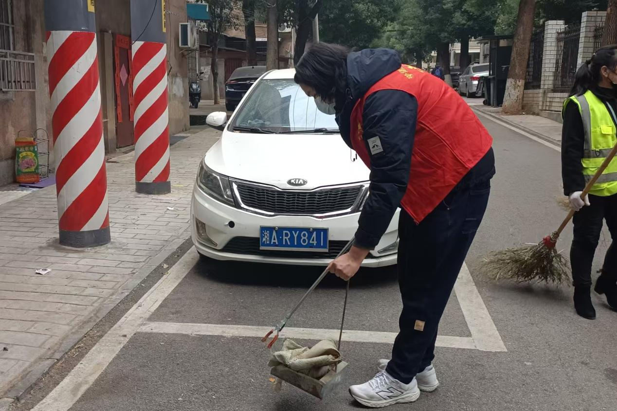 志愿者们提前来到望城坡湘仪社区,由负责人为其分发扫帚、垃圾夹等清洁工具。志愿者们自行分成多个小组,部分志愿者沿着社区主干道、单元楼门步道清扫,将落叶、尘土、零食包装袋等扫成小堆,并用灰斗将扫拢的垃圾铲入垃圾袋,同时顺手清理垃圾桶周边散落的杂物。其他志愿者深入绿化带缝隙、楼梯转角等清洁难点区域,夹取并清理隐藏其中的烟头与塑料瓶碎片。志愿者们表示,拿着工具一点点清理时,才真切感受到不起眼的小垃圾也会影响环境,亲手把社区扫干净的成就感,比单纯了解环保知识更实在。