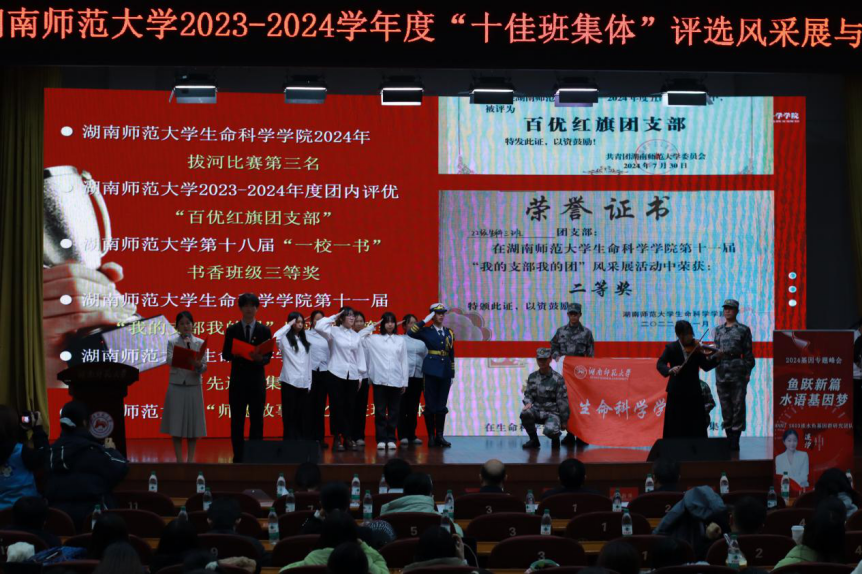 (通讯员 王佳佳 唐雨楠 刘永琪)12月10日晚上,秋霰纶理在三级2022级生物科学03班于国际学术报告厅参加湖南师范大学2023—2024年度“十佳班集体”风采展示与答辩。学工办主任兼2022级辅导员周冲、团委书记兼2024级辅导员罗静伟、2023级辅导员吴晴、2021级辅导员刘迎彬作为嘉宾参与此次活动展演。生科院2022级生物科学03班参加此次风采展示与答辩。
