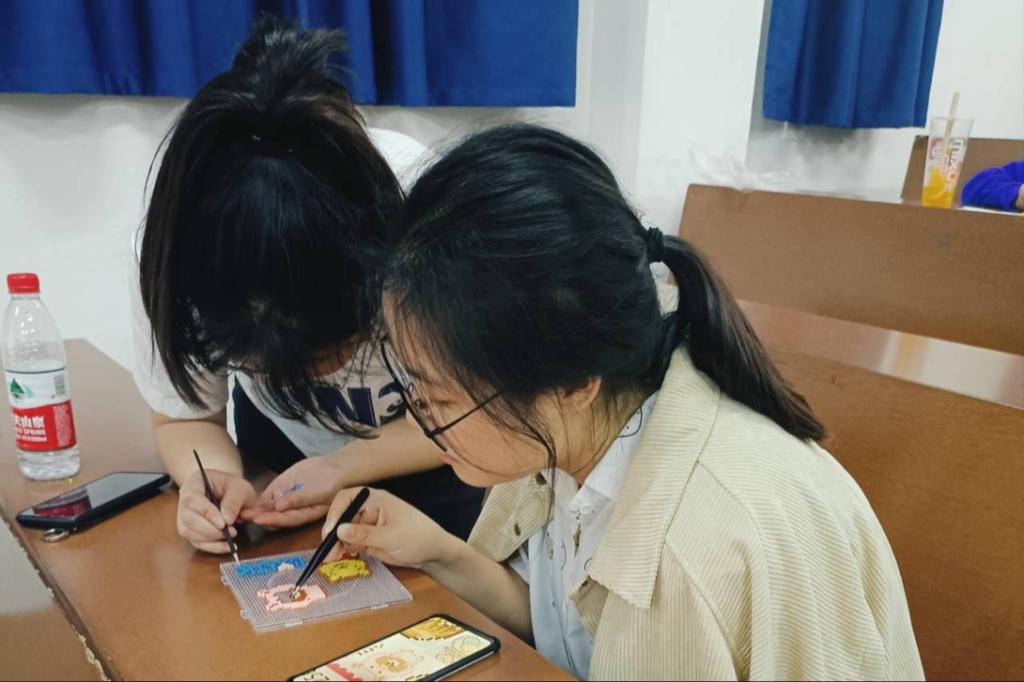 此次活动分为介绍活动、选择材料、制作模型、拍照留念四个部分。陈洁向同学们简述了拼豆的制作方法,并强调了制作过程中的注意事项。社团各负责人维持现场秩序并为会员提供相应工具。会员在活动现场领取材料,参考已有的模型图片,自主设计拼豆作品。