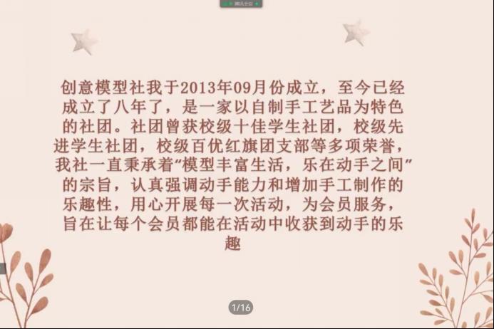 (通讯员 张馨月 庾雪菲 赵婧)11月13日下午,秋霰纶理在三级创意模型社举行线上会员动员会议。生科院创意模型社理事张馨月担任此次会议主讲人。