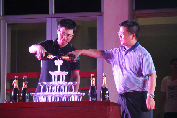 陈宇、彭贤锦开启香槟为毕业生庆祝