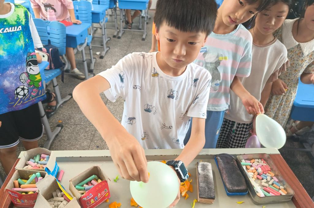 此次活动由庾雪菲讲解实验、学生动手实践以及分组进行比赛三部分组成。庾雪菲向学生讲解橘子皮分泌物引起气球爆炸的原理。学生动手实践,并分为三大组进行比赛。老师根据每组学生完成实验的时间长短选出优胜组。