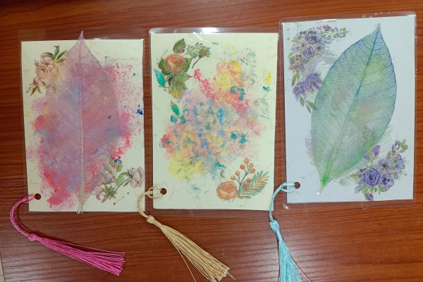活动由事件主持人介绍和会员制作两部分组成。主持人以口述的形式介绍了叶脉书签的制作流程,分为染色、贴画、塑封、打孔、系流苏五个步骤。此次活动提供了颜料、贴画、卡纸、流苏等色彩丰富,形式多样的装饰材料,以及画笔、塑封机、叶片等基础材料,为会员进行精美的创作提供了物质基础。会员利用这些材料可以进行各式各样的创作,根据自己的喜好涂染上不同的底色,绘画出不同的图案。不同的想法,不同的风格在此次手工活动中激烈碰撞,迸发出千姿百态的叶脉书签。会员制作好的叶脉书签可以选择拍照展示或者自行收藏。