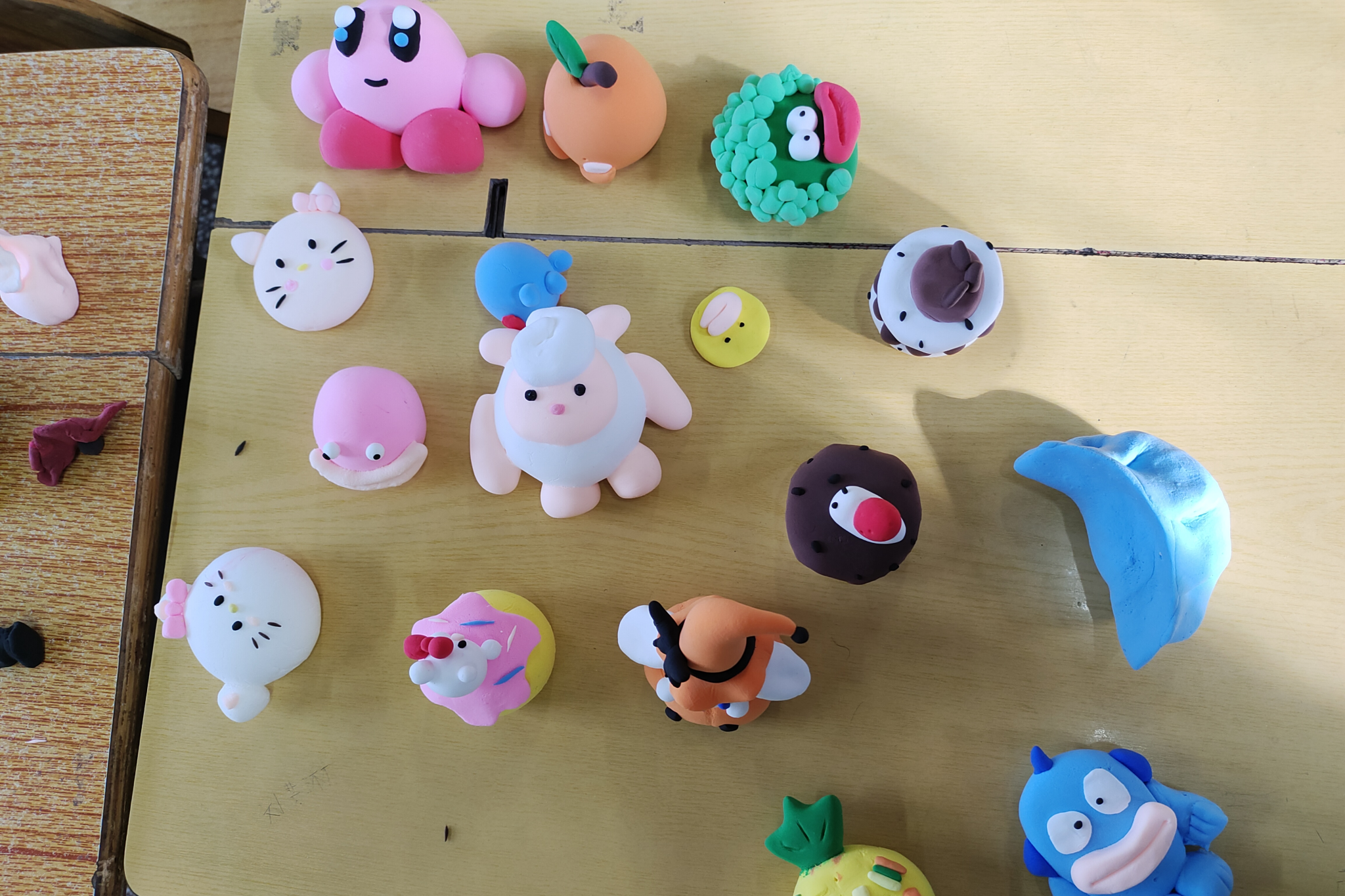 岳睿敏介绍超轻粘土是纸黏土的一种,因捏塑容易舒适被称为超轻土,并讲解制作工具的使用方法。她提醒同学们制作前需把超轻粘土充分揉匀,反复拉伸以达到作品表面更加光滑平整的效果,且需在黏土还未干时组合作品使各个部位粘得更为牢固。此外,岳睿敏建议捏作品时按照先大后小的原则,即先捏制大部件再捏小部件,以更好的把握超轻粘土的形状。实践团成员将材料分发给同学们并辅助他们制作。同学们参考网络图案并加以自身想法进行修饰,或根据想象力制作原创作品,完成后学生相互展示并将作品赠与实践团成员。