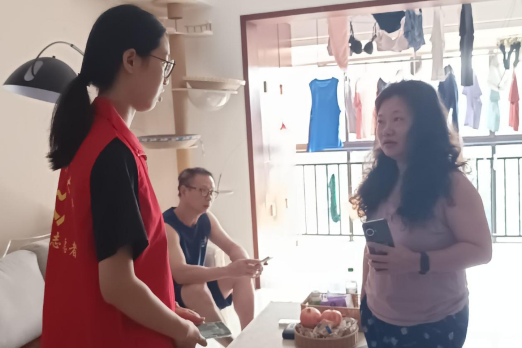 志愿者与走访老人的子女交流