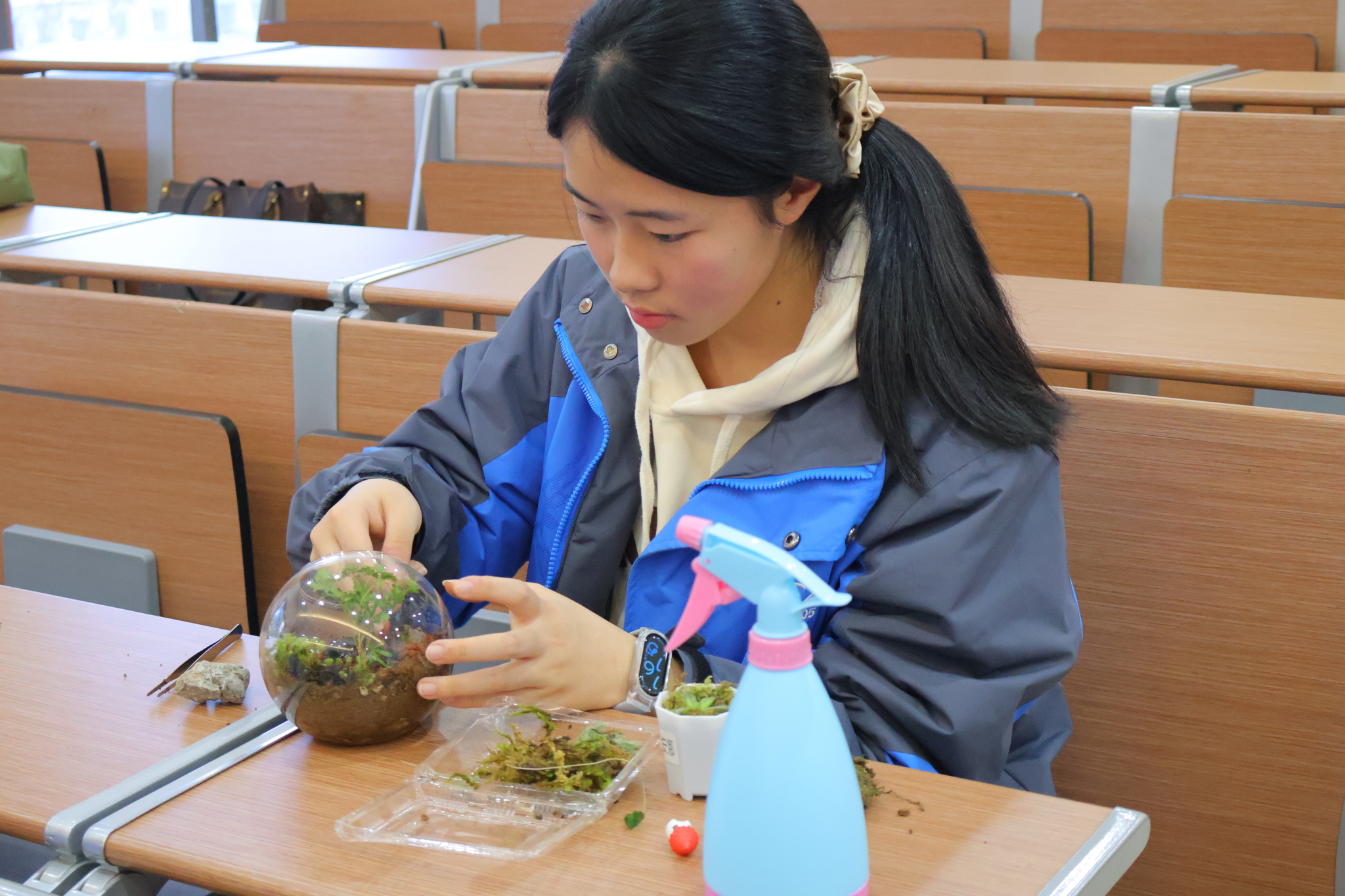 活动伊始,社团工作人员引导同学们有序入场,并为大家分发伴手礼。主讲人借助PPT,围绕生态瓶制作的理论知识、所需材料、操作步骤及注意事项展开系统讲解,并展示创意成品范例。随后,同学们在工作人员的协助与指导下,自主设计生态链,领取材料动手制作,大家充分发挥创意,享受创作乐趣。活动过程中还穿插图画捉迷藏等趣味小游戏,进一步活跃现场氛围。