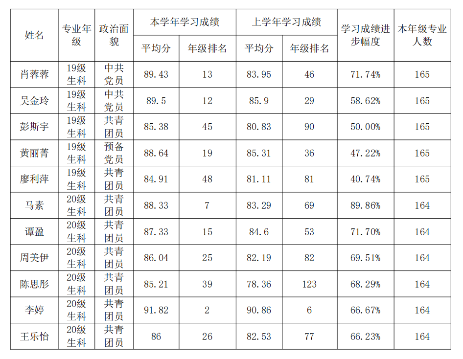 经学生本人申请、学院奖助学金评审工作小组研究审定,拟推荐肖蓉蓉等11名学生参评“长沙银行 2021-2022 学年度公费范生学业进步奖学金”,现将名单公示如下: