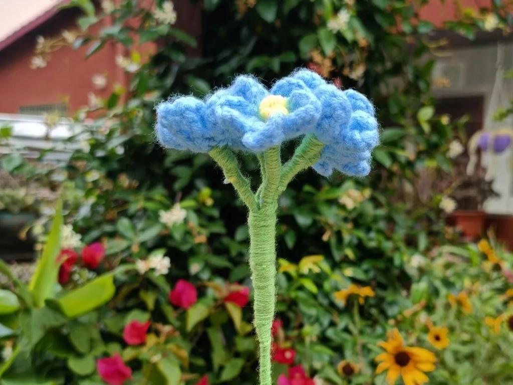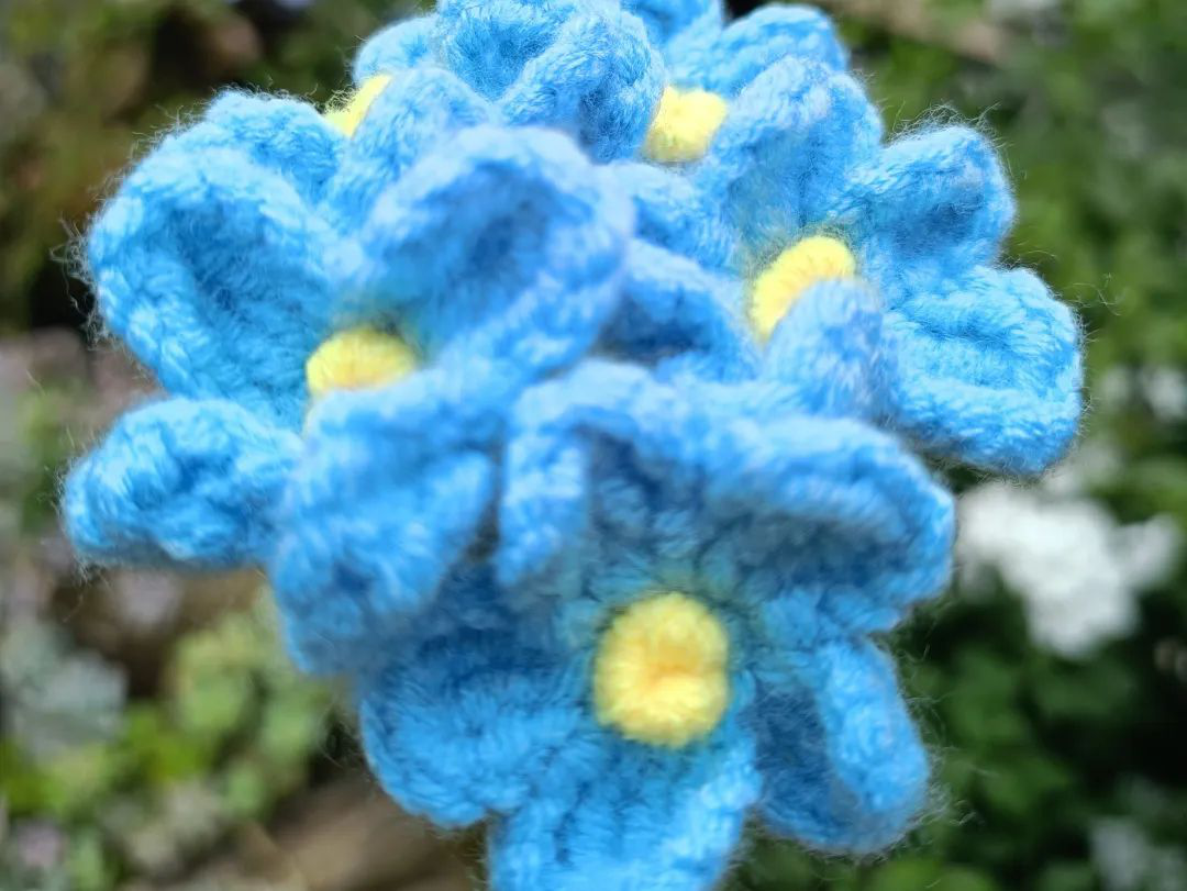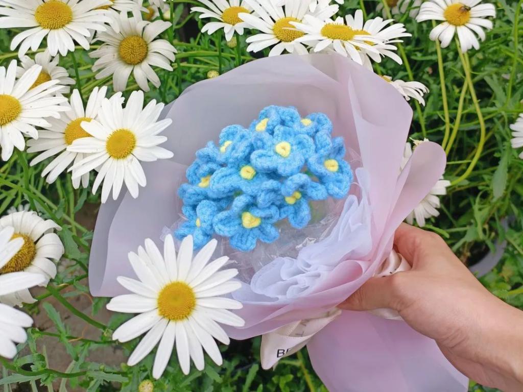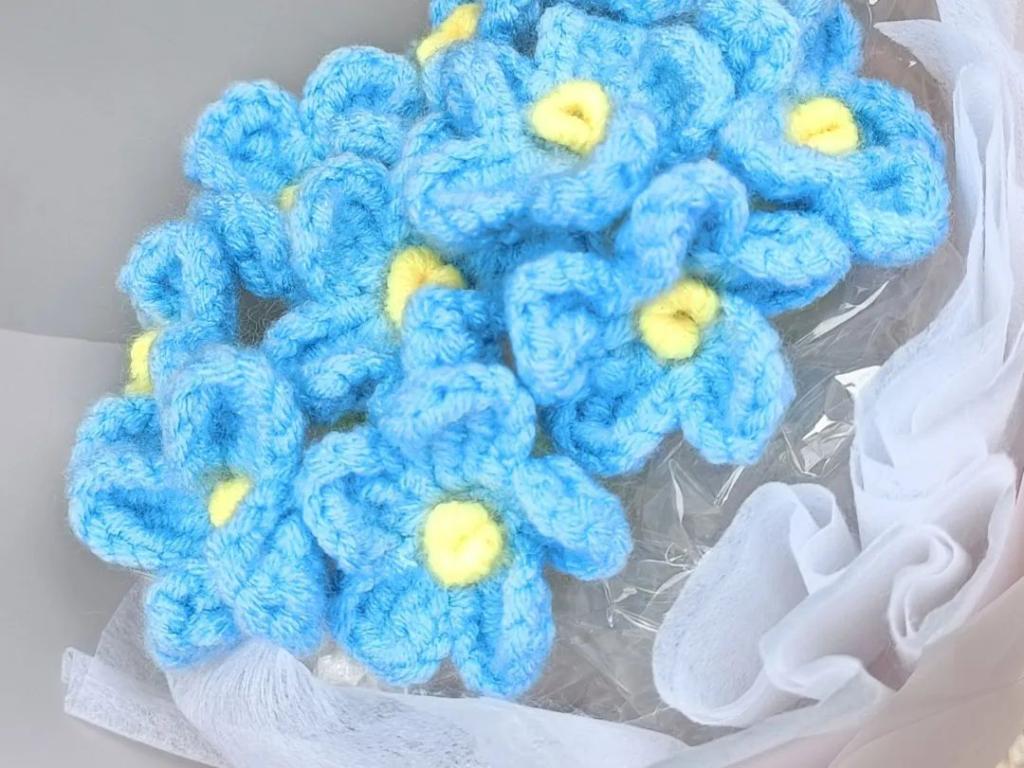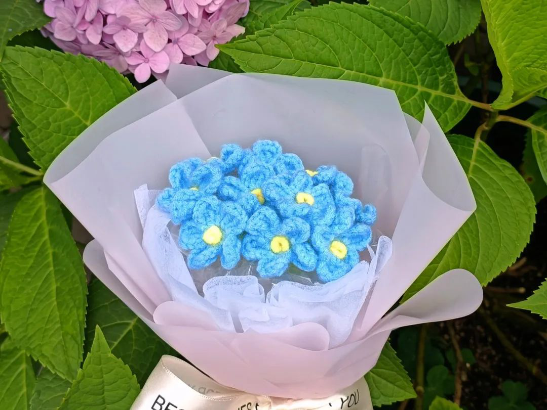 作品借鉴网络钩织作品,借勿忘我花束来表达对即将毕业的学长学姐们的不舍与祝福。