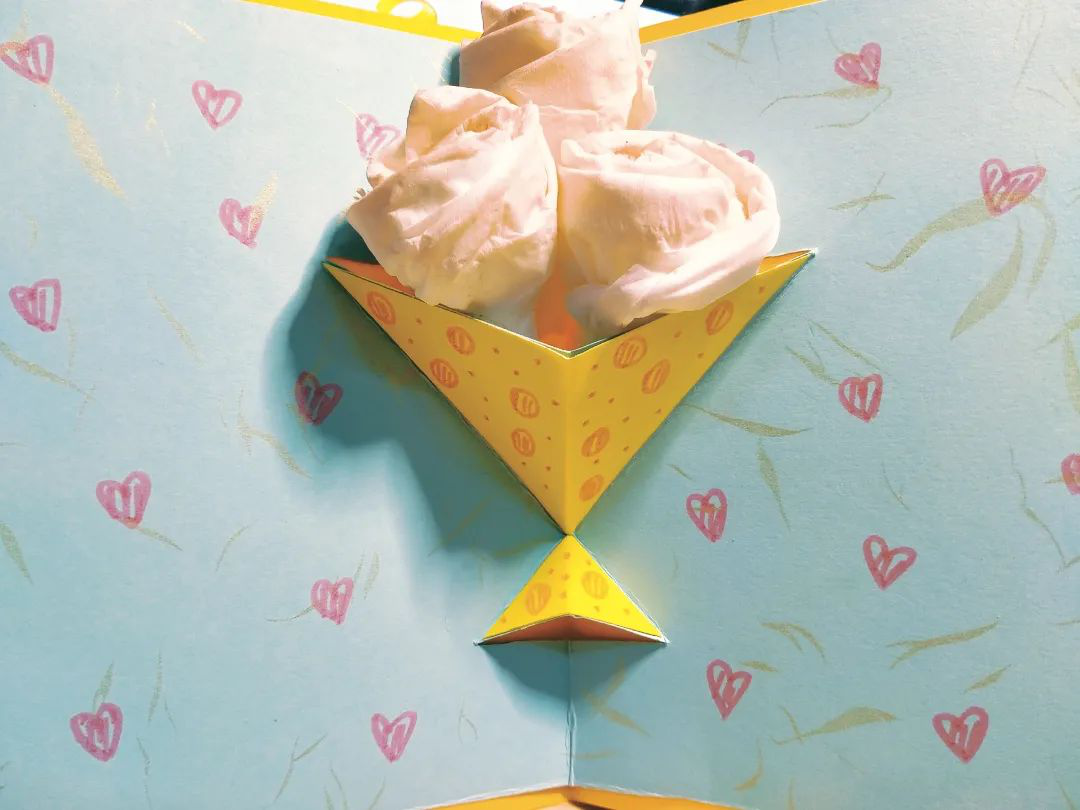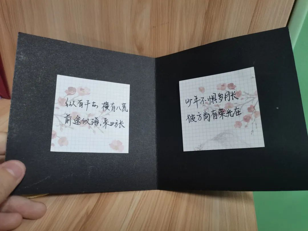 这个作品名叫“学士帽扬起的夏天”。它折起时是学士帽,打开就变成了贺卡。学士帽是毕业时大家很重视的一个东西,扬起它,就代表自己将脱离本科生的身份,更加独立地面向未来。祝福的话语很多很多,我摘取了最喜欢的两句写在这里,祝愿各位学长学姐能实现自己的梦想,扬帆起航!