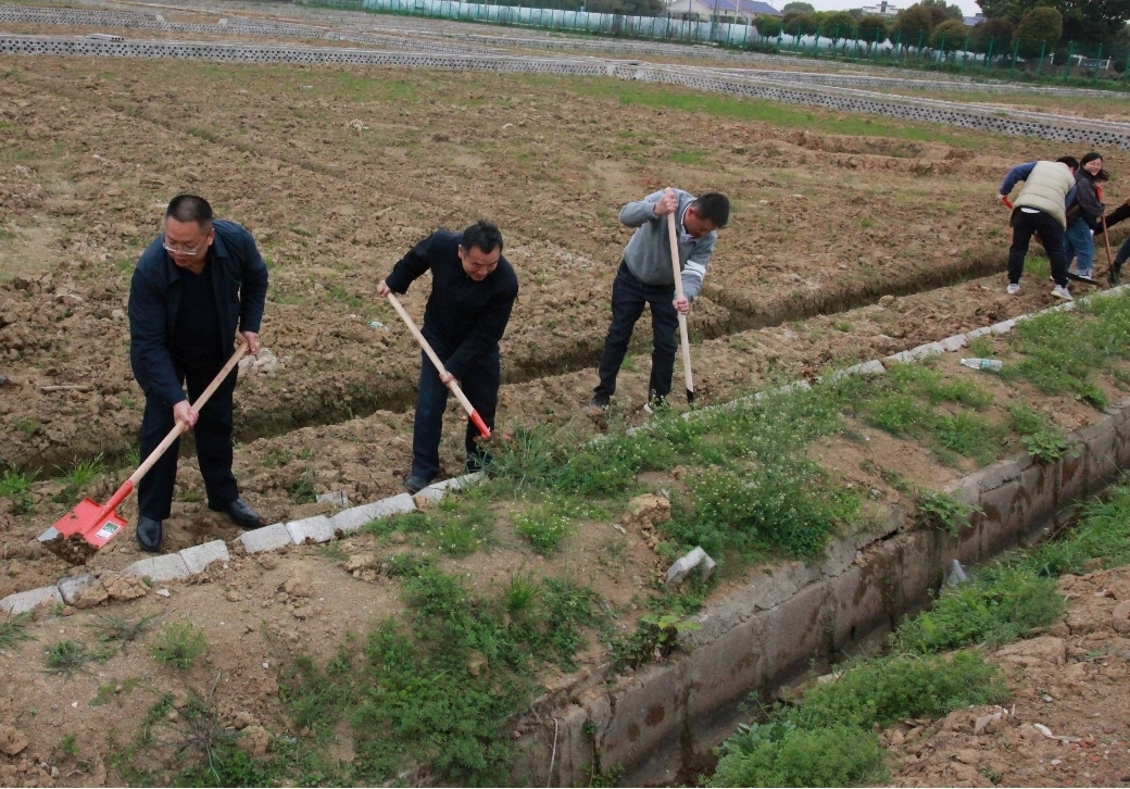 在学习讨论后,刘少军院士和谢罗庚书记带头抡起了农具,走到了稻鱼综合种养实验田间,将“论文写在大地上”落到实践中,带领大家对稻鱼综合池田生态坡进行前期平整工作。在耕作间,覃钦博教授总结了近期和刘少军院士一起对省内外稻鱼综合种养的调研情况,畅谈生态种养新模式的发展前景。师生们井然有序,边学边干,完成了多块大实验田的生态坡平整工作。对于很多学生来讲,这都是第一次下田,锄头抡久了,手有点酸痛。刘少军院士安慰和鼓励大家说:“大家要多来锻炼,锻炼多了就不痛了。我们要常来这里调研实践,开动脑筋,创新创建生态养殖模式,要把论文写在大地上”。师生们“人心齐、干劲足、执行强”的风貌在春日的田间谱画出了一道美丽的风景。