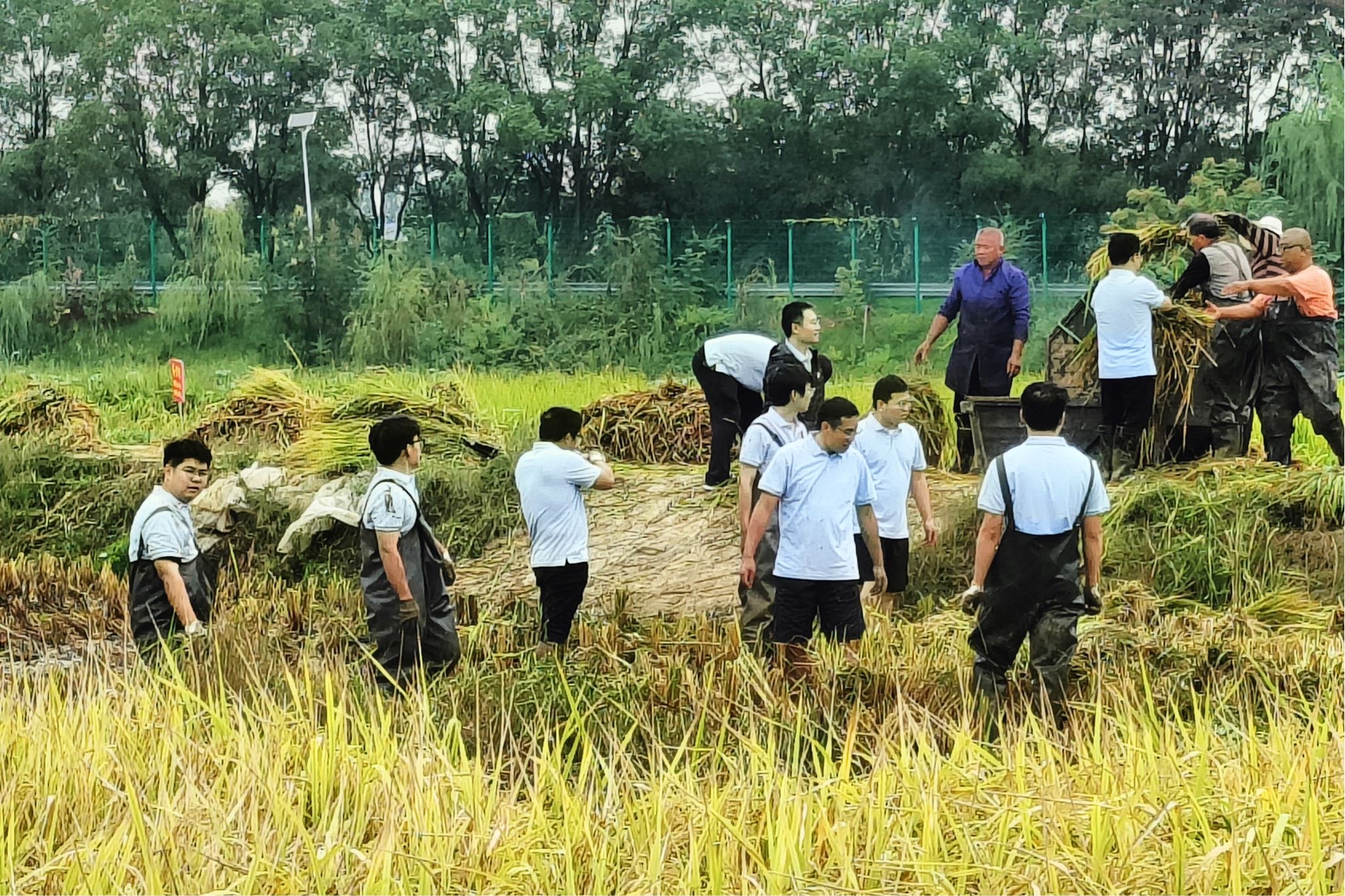 下午一点,在刘少军院士的带领下,教师党员和学生党员们都挽起裤腿,撸起袖子,弯下身子挥动镰刀收割水稻。在打谷机的轰鸣声中,大家相互协作,一组负责收割水稻,另一组负责打谷晒稻。一排排金黄的水稻被割倒,一条条饱满的谷穗被脱粒装筐,田间弥漫开稻香。挑着满载谷子的箩筐向晒谷坪大步走去,师生党员们脸上都洋溢着丰收的喜悦。在所有人密切的配合下,主题党日活动落下帷幕。