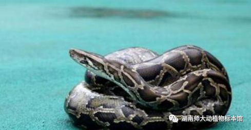 我馆有3件成年蟒蛇标本,其一是1970年从广州购得的一蟒蛇,当时蟒蛇还活,老师们不忍心杀死它,就用笼子装着放在水里,放了一个月从水里捞上来还活,可见其生命力旺盛。它产了32个蛋,将蛋放在办公室的桌边。某一天早晨,动物学老师进办公室,打开门,惊呆了,蛇蛋全部孵化成小蟒蛇了,太神奇了!如今标本馆还保存着小蟒蛇的标本呢!它有蟒蛇的一个重要而显著的特征,小蟒的泄殖腔两侧有一对非常明显的角质爪状物,即退化的后肢残迹。标本馆还保留了一个已孵化的卵,供参观者欣赏。另外两件标本1982年12月采自海南省的海口。