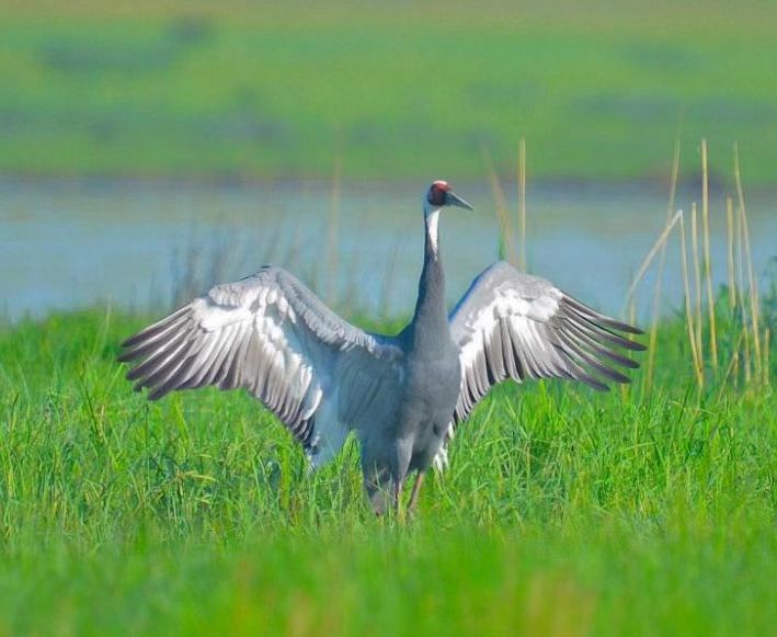 白枕鹤(Grus vipio)为鹤形目鹤科鹤属的鸟类,又称为红面鹤,是国家Ⅰ级重点保护野生动物,被IUCN列为易危(VU)物种。