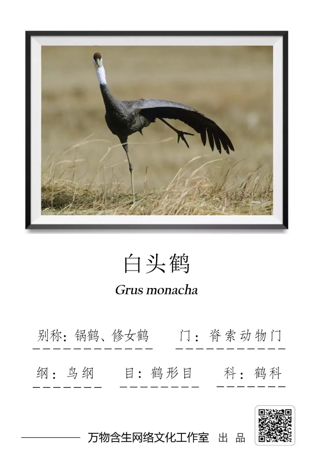 白头鹤为鹤科鹤属的鸟类,俗名为修女鹤,其保护级别为易危(VU)IUCN标准。
